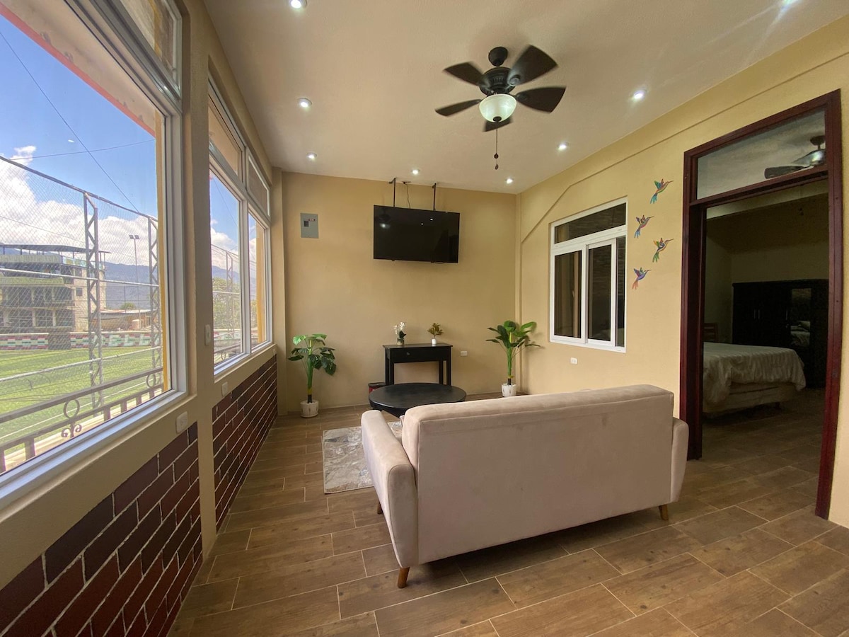 Gyönyörű, modern és tágas társalgó egy privát családi társasházban (La Perla), 5 percre a Retalhuleu IRTRA parkjaitól. Ideális a családdal való utazáshoz. - A gyerekek imádják a medencénket. Belső parkolás 2 jármű számára, további 2 járművel az utcán. Wifi, kábel- és mosási szolgáltatás (mosógép és szárítógép). Meleg víz a zuhanyzóban. A lakóépület parkokkal és zöldterületekkel rendelkezik.