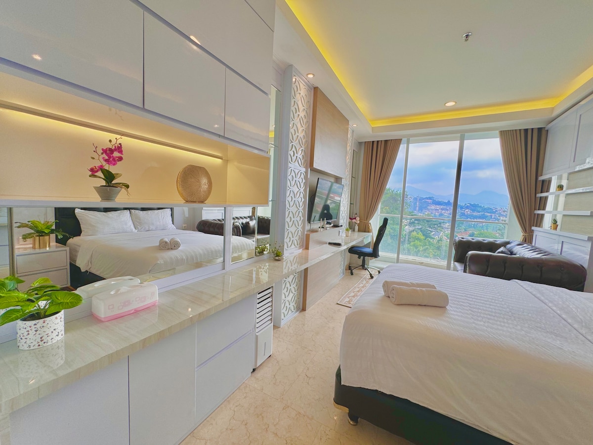 Immerse yourself in the vibrant heart of Bandung at this stylish studio on 10th floor of Parahyangan Residences. Enjoy modern amenities like a fully-equipped kitchen, high-speed Wi-Fi, and a 50" smart TV with Netflix. Indulge in resort facilities, contactless check-in, and nearby conveniences for a perfect staycation, holiday, or work-from-home experience. Now featuring a Reverse Osmosis drinking water, food waste disposal and new washing machine.
