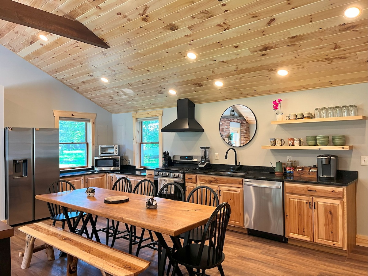 Modern ház 22 hektáron Sullivan megyében, nyitott konyhával, étkezővel és nappalival, 77 hüvelykes OLED TV-vel. A teljesen felszerelt konyhában tűzhely, mikrohullámú sütő, mosogatógép és kétajtós hűtőszekrény található. Két hálószoba van – az egyik king méretű ággyal, a másik pedig queen méretű felfújható matraccal –, valamint egy queen méretű kanapéággyal. A légkondicionált otthonban játékterem is található légkorongozással, pingponggal és biliárdasztallal. Fedezd fel a gyalogutakat, és élvezd a Végtelen-hegység gyönyörű kilátását!
