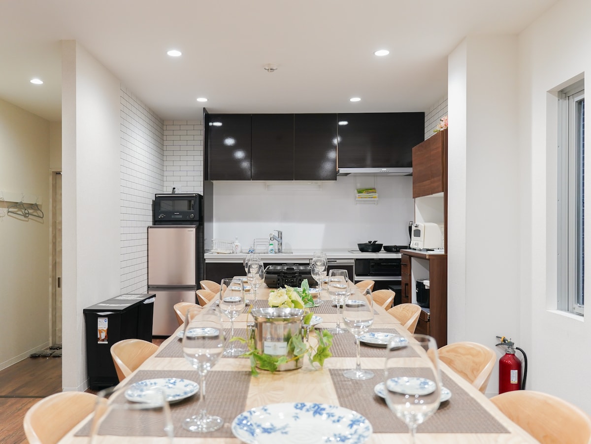 Enjoy a spacious Japanese-modern room with a cozy beds, tatami area, large dining table, kitchen. The room has 2 washbasins, 2 private showers, and 2 toilets, offering great comfort for groups. Located right in front of Tokyo Skytree, just 2 minutes to Solamachi and walking distance to Asakusa, it’s the ideal base for sightseeing. The area has supermarkets, convenience stores, and many restaurants. We have 9 identical rooms available. Experience your best Tokyo stay with us!