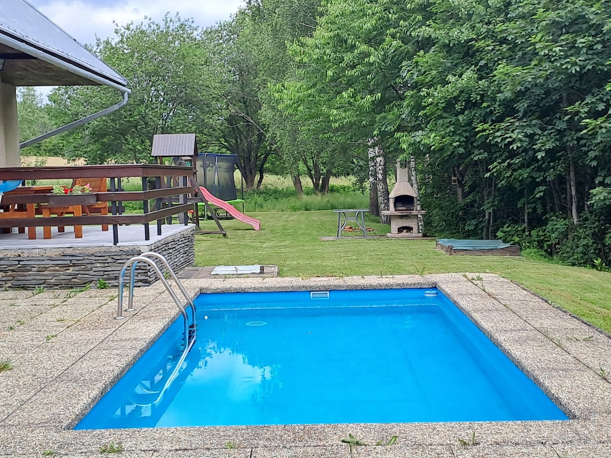 Gyönyörű hegyi wellnessház gyönyörű helyen, a természetben, közvetlenül az erdő alatt, kilátással az erdőkre és rétekre. - Kapacitás akár 10 fő + 2 csecsemő - Luxus egész évben használható USSPA pezsgőfürdő + színterápia - Fűtött medence tetővel, világítással és gyermekzárral - Minőségi szauna, grill, kandalló, tűzrakóhely - Baba barát: 2 kiságy, játszótér, játszósarok, etetőszékek, fellépő, bili, kád, nyugágy... - Az erdő mellett, magánterületen - A Králický Sněžník és Dolní Morava közelében.