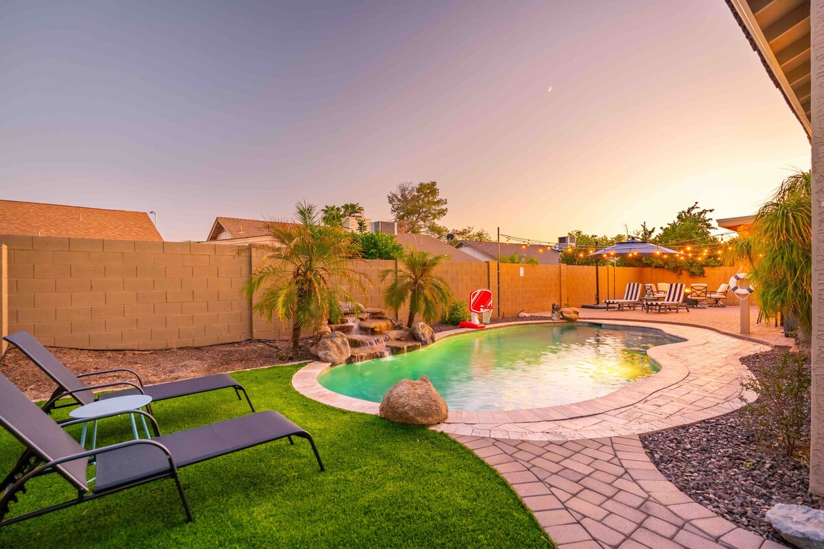 The Sandlot on Ross is a luxury 4 Bedroom, 2 full bath rental home experience. A West Valley elsőrangú profi baseball-, futball- és golfkomplexumaitól mindössze néhány percre található otthon a sport szerelmeseinek igazi paradicsoma!! Mariners/Padres Spring Training facility is literally just minutes away, with the Cardinals State Farm Stadium right down the road! Az Arrowhead Towne Center bevásárlóközpontja is a közelben található, nagyszerű mozikkal és éttermi lehetőségekkel. Imádni fogod itt!