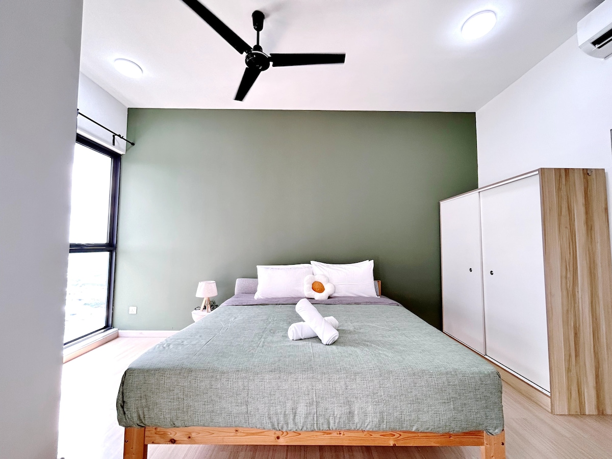 Ez egy 550 négyzetláb méretű, egy hálószobás stúdiólakás * Főszoba 2 queen méretű ággyal * Kanapé (tud aludni) a nappaliban * Kényelmesen elfér benne akár 5 felnőtt * Ingyenes parkolóhely egy autó számára, második autó esetén maximum 1 napra 10 RM Felszereltség: - 2 egység légkondicionáló - 55 hüvelykes 4k okostévé (Netflix, YouTube) – Kanapé L SHEET (alvásra is alkalmas) - Vízi hanga - Hajszárító - Hűtőszekrény - Elektromos vízforraló - Vasaló - Testápoló sampon - WIFI 100MBPS - Mikrohullámú sütő - étkezőasztal – konyhaszekrénybe épített főzőlap