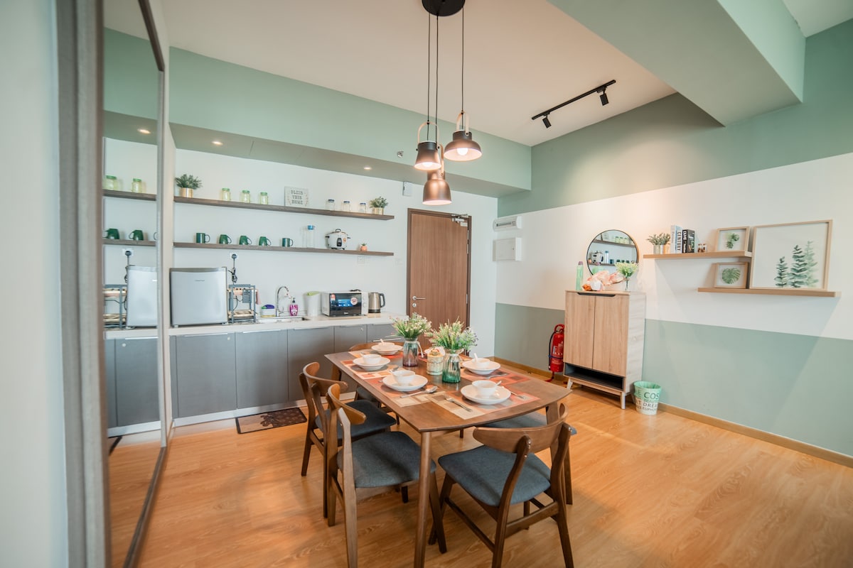 🌊 MySerene@KWRC – Tágas Seaview lakosztály a tökéletes családi kiruccanáshoz 🌅 Tágas, modern lakosztály, amelyet a családodnak terveztek, hogy visszavonuljanak, pihenjenek és újjáéledjenek. Ébredj a tengerre nyíló látványos kilátásra, a lélegzetelállító napfelkeltékre és a kanapé kényelméből érkező hullámok nyugtató hangjára. A fő hálószoba panorámás kilátást nyújt, ahol az ég találkozik a tengerrel, míg a hangulatos ablakpad a kikapcsolódásra invitál. A konyhában egy stílusos, 6 személyes faasztal található, amely minden alapvető eszközt tartalmaz a könnyű étkezéshez.