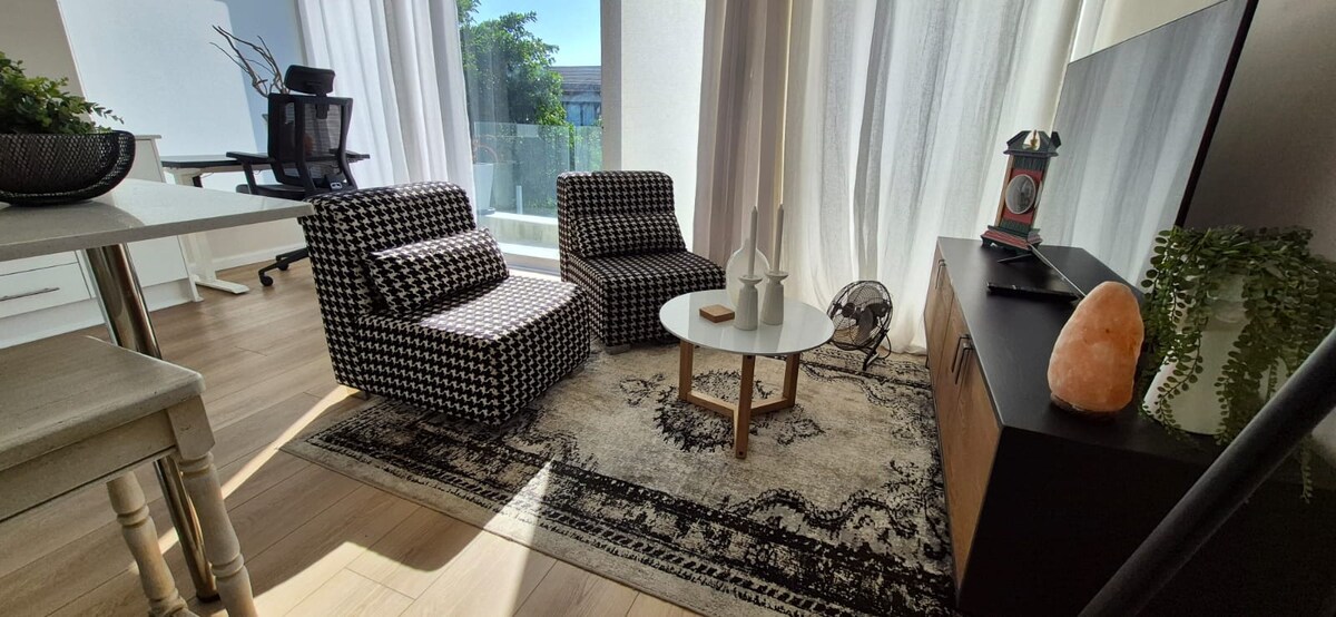 Pihenj ebben a kettős modern vendéglakosztályban, kevesebb mint 5 perc sétára a strandtól, a Tábla-heggyel a háttérben. A lakosztály saját bejárattal, biztonságos parkolóval, saját kerttel, 2 hálószobával, saját fürdőszobával, felszerelt konyhával, étkezővel és társalgóval rendelkezik. Miközben „otthon” élvezheted a vezeték nélküli internetet, a napenergiát, a Netflixet és a helyszíni közös úszómedencét a széltől védett udvaron. A lakosztály 3 km-re van a Mediclinic-től, 12 km-re a borászatoktól, 16 km-re a vízparttól és a CBD-től, 22 km-re a repülőtértől. 10 perc sétára vannak az üzletek.
