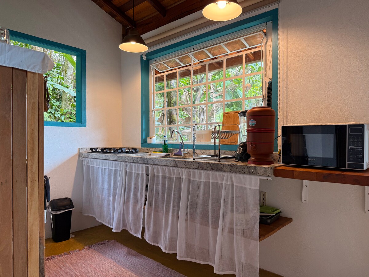 Este chalé único e charmoso tem tudo para vc relaxar ao som de uma pequena cachoeira, admirar a vista especial para o mar e se conectar com a natureza. Ele está inserido em exuberante mata atlântica com belíssima vista para as montanhas e para o mar. Por uma trilha de 30 m vc tem acesso à costeira, onde vc pode pescar ou simplesmente observar o mar e visualizar o arquipélago da Ilha Comprida de Ubatuba.