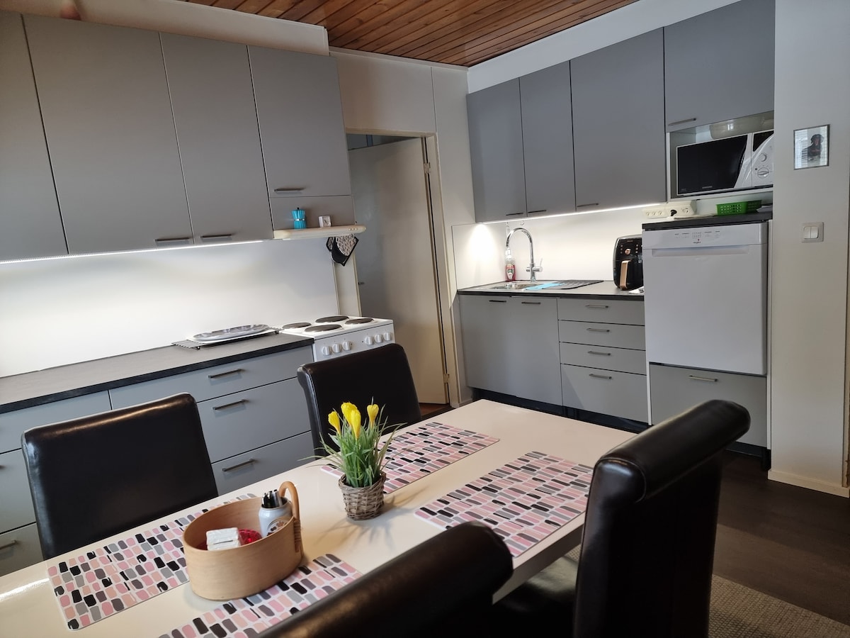 Otthonos, tiszta lakás saját bejárattal. Teljesen felszerelt konyha. A szauna naponta fűthető, a vendégek hűsölhetnek a védett teraszon, grillezhetnek (gáz) és kandalló is található. A hálószobákban bevetett ágyak (160 cm, 120 cm). Nappali kanapéágy (140 cm). Utazóágyak kisgyermekek számára. Háziállatok is szívesen látottak (kérjük, jelezze a foglaláskor). Az ágynemű, a törölközők és a végső takarítás az árban van. A lakás Kajaani központjától körülbelül három kilométerre található a repülőtér irányába.