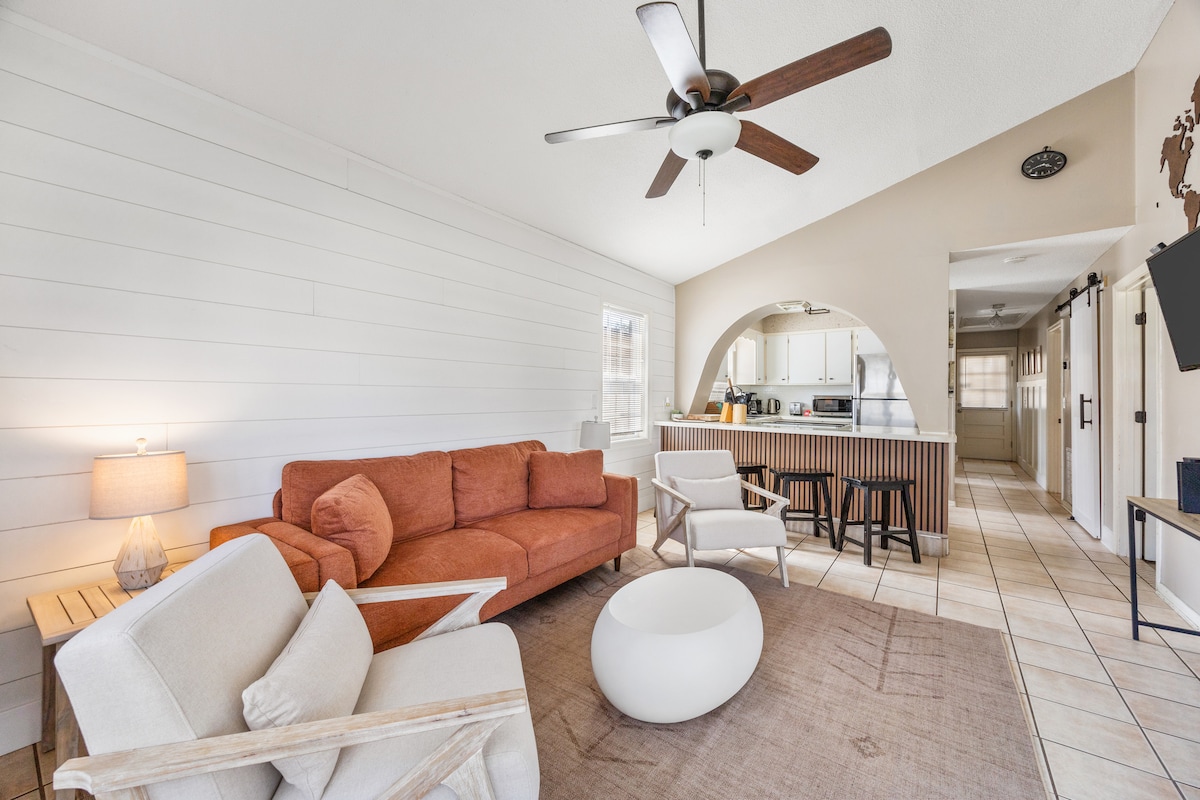 Relax and enjoy our cozy upstairs Beach Cottage amidst majestic live oaks. - 100 steps to the beach (Public access at the property) - Modern "Beach" renovation (ALL NEW APPLIANCES/AC/HEAT) - NEW Tankless H2O heater = endless HOT water for the entire Family - Dog friendly (No Breed, Size, or # Restrictions) Pet Fee = $95 - Outdoor kitchen and BBQ Grill - FREE Parking - Seamless check-in with private keycode - 75-inch Flatscreen smart TV - Cottage on a large double-lot - NO refunds due to weather