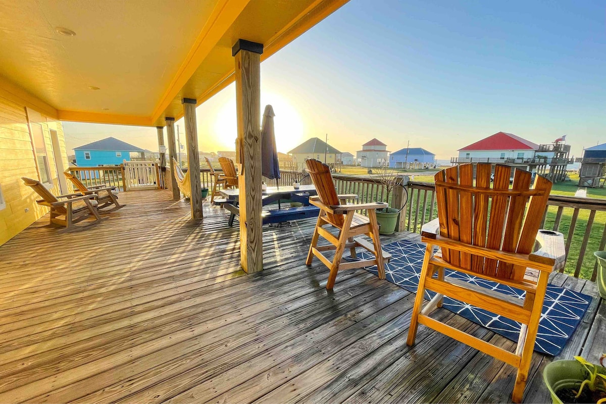 Walk to the beach in 1 minute. Beach views, a 7-person LED hot tub, large deck seating 12, fire pit, and spacious half-acre yard. Cook outside on the Blackstone, smoker/grill, or Breeo grate. Outdoor rainfall shower, fast Starlink WiFi, Smart TVs, washer/dryer, parking, and a Level 2 universal EV charger. Fully stocked, family- and pet-friendly Crystal Beach home.
