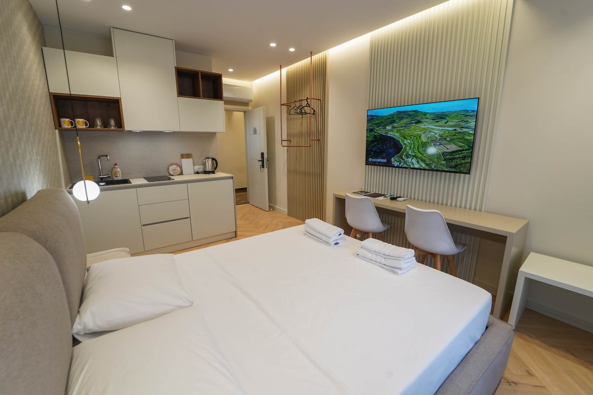 Welcome to our lavish studio apartment in the heart of Tirana! A prime location, fully-equipped kitchen, a plush king-size bed, and a bathroom with premium toiletries. Enjoy the breathtaking city views from the private balcony while sipping your morning coffee. Just steps away from the city's finest restaurants, cafes, shops, and cultural attractions, our opulent Airbnb studio is the perfect getaway for discerning travelers seeking an unforgettable experience in the charming capital of Albania.