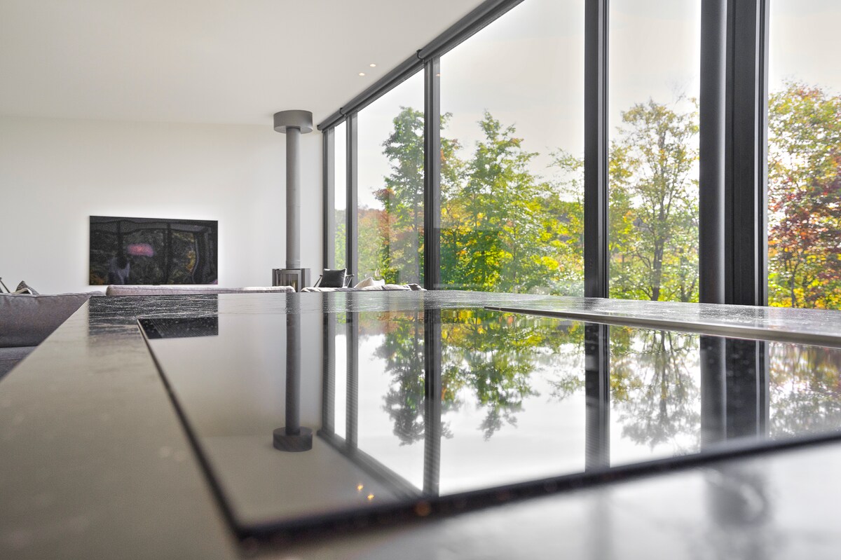 Hangulatos, időtlen faház, amelyet a_naturehumaine építészei szerveznek. A 490 méter (1600 láb) magasságban elhelyezkedő sziklafalú egyedi dizájnját merészség és eredetiség jellemzi, és a környezetében harmóniában illeszkedik. Az erdővel körülvett házikóból lélegzetelállító kilátás nyílik a Glen-hegyre és a környező természetre, amelyet nagyrészt az Appalachian Corridor véd. Tökéletes csendes hely a kikapcsolódásra és a kikapcsolódásra. Fotó: Adrien Williams / S.A. CITQ #302449
