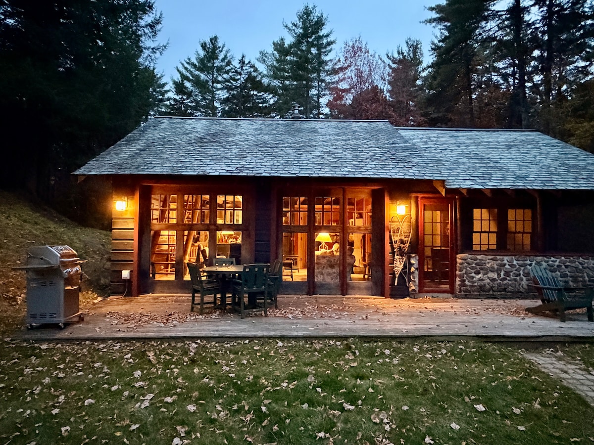 If you’re looking for serenity, peace and quiet, you've found it, amidst a 250 acre private estate. On a lake at the end of a mile long driveway (well plowed in the winter) Is Snowshoe Cabin. Built in 1929 as the garage for "Lakefalls Lodge, it's been completed renovated into a luxurious, cozy home with modern amenities. Guests rave about "views of the snowy pond while you’re warm inside" from heated floors and a wood burning stove with free firewood. Spikes provided for wonderful winter walks.