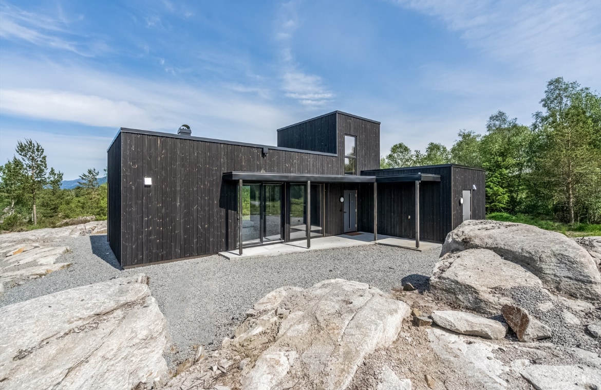 Et unikt, idyllisk, lite trehus i moderne stil. Fargepaletten i denne hytta er i varme og omsluttende toner. Solide skinnmøbler og gamle interiørdetaljer skaper en koselig rustikk effekt. Svarte tak og vinduer rammer inn utsikten og naturens farger utenfor. Her faller lyset inn fra det store vinduet over den høye kjøkkenbenken og du kan sitte og nyte utsikten over skogen og fjorden.