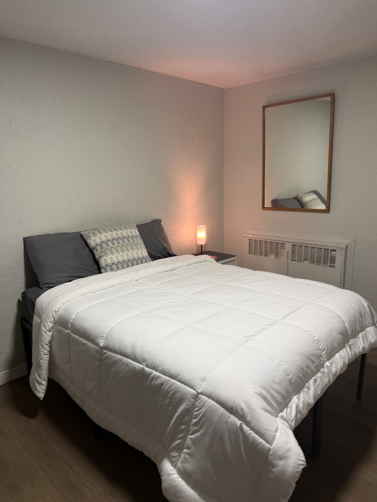 "No-frills" 1 Private Single bedroom with ensuite bath. Has 1 King size bed. This includes an ensuite bathroom with a shared laundry area with washer and dryer. This unit does NOT have access to any other area of the building, there is no access to a kitchen or living room. Situated down the street from a lovely park and within walking distance to the downtown area. Available for nightly rentals. You will be close to everything when you stay at this centrally-located place.