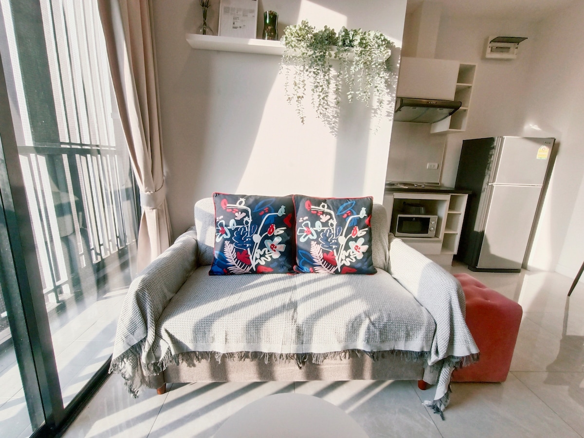 Üdvözlünk, vendégek. Ez a hely békés,csendes, és messze van Bangkok városától. Sok időt vesz igénybe, és nehéz eljutni a városba. Alkalmas azonban arra, hogy 50 mbps sebességű Wi-Fi-vel távolról dolgozz, és helyben élj. Az épület a Ngamwongwan Rd. A két nagy bevásárlóközpontban szinte mindent megtalálsz. Rengeteg kényelmes üzletek és élelmiszer standokon ezen a területen. A 7/11 1 perc sétát jelent. Nincs napi takarítás a szobában. Vedd fel velem a kapcsolatot a takarítási szolgáltatásért alkalmanként 300 TB értékben.