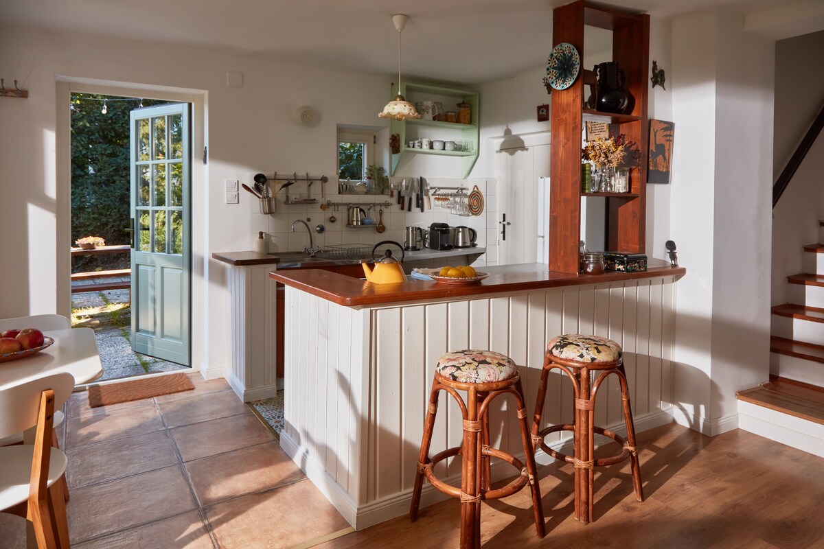 Kertes faházikó Nagymaroson, az erdő és jelzett túraútvonalak és kerékpárút közelében. Nyugodt környezetben, a vasútállomástól 12, a Duna-parttól és erdőtől pedig kb. 10 percre található. Autóval könnyen megközelíthető. Sweet chalet with a garden, located in Nagymaros, near to the forest and cycle road in a calm & quiet area, still 1.2 km from the trainstation and centrum of the village and 10 minutes (by feet) from the Danube. The house is easily accessible by car.