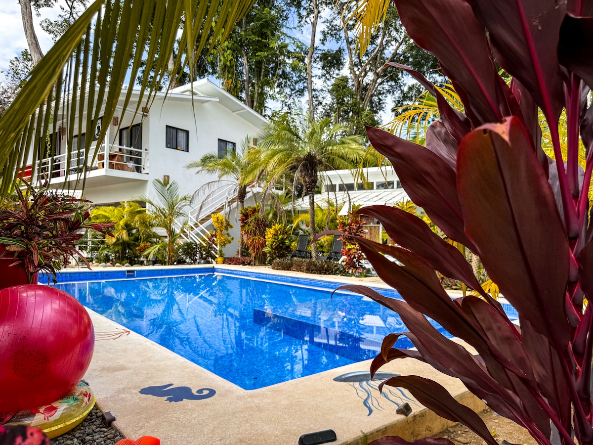 Charming boutique, adult-only hotel with three rooms, one 1-bedroom casita, and one 2-bedroom casa.* This room includes a private bathroom, full size bed, AC, hot water, bidet,linen, fan, closet and desk. Amenities: Pool, bar, Lounge, games, Outdoor shower, bikes, Shared kitchen, Bikes, WiFi, Gardens , limited Secured parking - (please request), Laundry, Barbecue/firepit. Just a 5-minute walk to the beach and a 15-minute walk to Puerto Viejo center. *Click host details for more info.