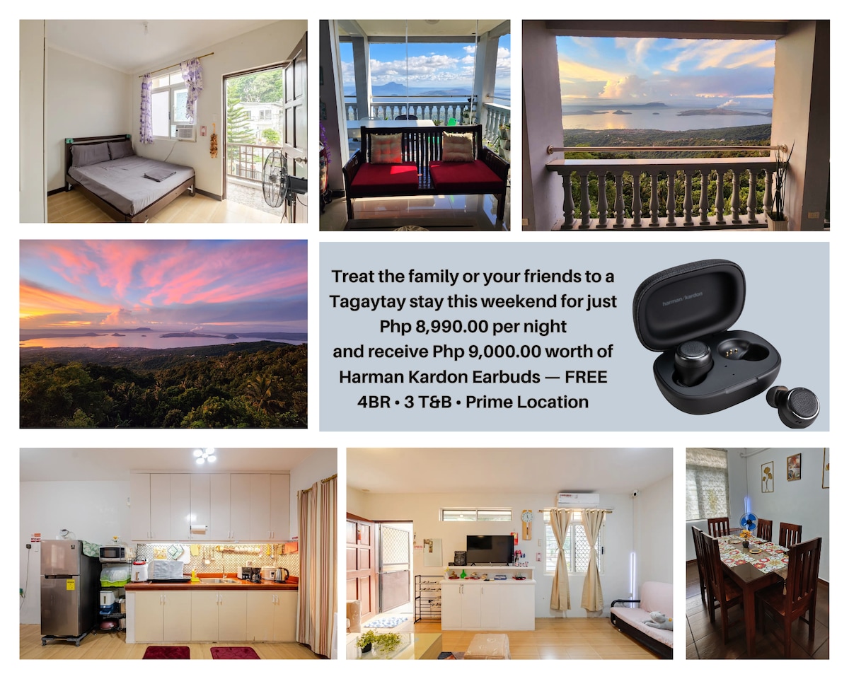 Treat the family or your friends to a Tagaytay stay this weekend for just Php 8,990.00 per night and receive Php 9,000.00 worth of Harman Kardon Earbuds — FREE Enjoy a spacious and comfortable home perfect for groups: - 4 Bedrooms - 3 Toilets & Baths - Private gated parking (fits up to 3 vehicles) - Fast fiber internet (50–400 Mbps) - Fully equipped kitchen with complete utensils, cookware, and grill - Smart TV, microphone, and speaker for videoke sessions