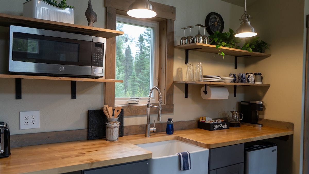 Üdvözlünk ebben a fák közé épített, kicsi, modern víkendházban. Lassú reggelekre és a szabadban töltött hosszú napokra készült. Sétálj 5 percet a Talkeetna Lakes Park ösvényeihez, és töltsd a napot síeléssel, kerékpározással, túrázással vagy evezéssel ebben a gyönyörű parkban. A Flying Squirrel pékség az út mentén található, ahol süteményeket vásárolhatsz, a kerékpárút pedig egyenesen a 6,5 kilométerre található Talkeetna belvárosába vezet.