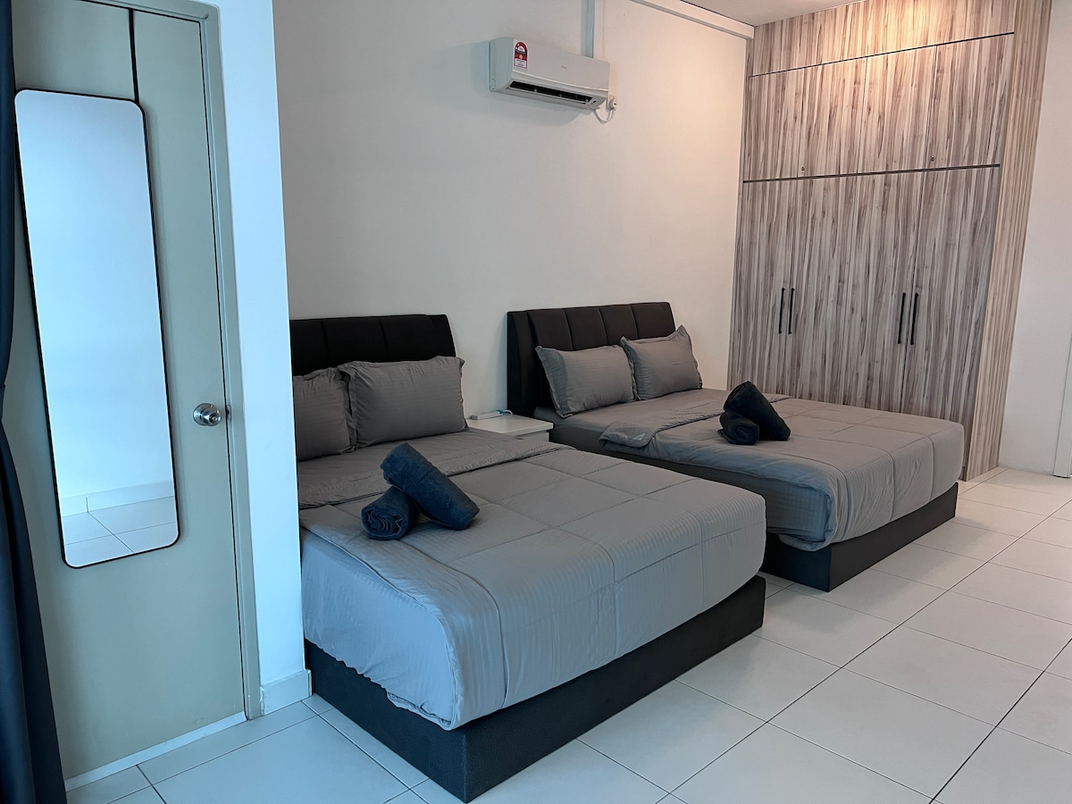 (1+1 BR és 1 fürdőszoba) Kortárs, modern és otthonos lakás JB városközpontjának szívében. Alkalmas 4 fős családnak, barátoknak és üzleti csoportoknak. **5 perc alatt elérhető a CIQ, a City Square, a KSL, a Pelangi és a Larkin **8 perc Mid Valley Southkey, Larkin Sentral és Sentosa városáig **15 perc autóval a Paradigm bevásárlóközpont, Sutera, Skudai és Mount Austin ✔ 4K SmartTV ✔ Nagy sebességű Wi-Fi, munkaasztalok hosszabbító csatlakozóval ✔ Mosógép ✔ Légmásodpercek minden szobában. ✔ Atari konzol, Mahjong és társasjátékok. ✔ INGYENES parkolás 1 autó számára