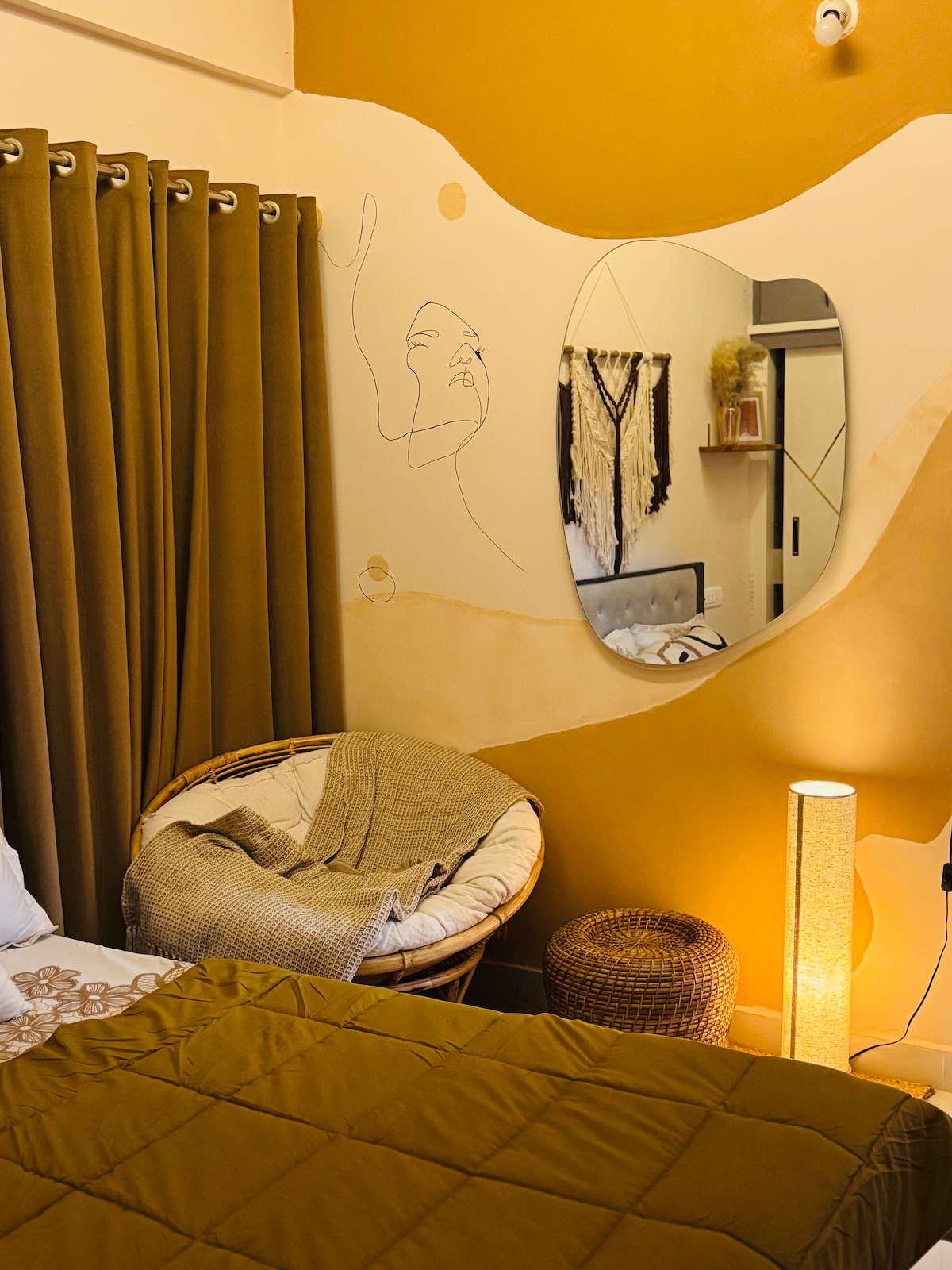 Completely Private with no sharing of any space, One Studio Room Small Apartment with a slab for kitchen & attached bathroom. New AC, cupboard, Queen bed with orthofoam mattress, ideal for two guests. kitchen area contains induction for cooking with utensils and cooking vessels. Hi-speed Internet connection for work from home Google TV with all Apps, AC, Fridge, Oven, Geyser, chairs, iron, etc, everything is there. Fully entilated place with 2 big windows. We need ID proof of all guests.