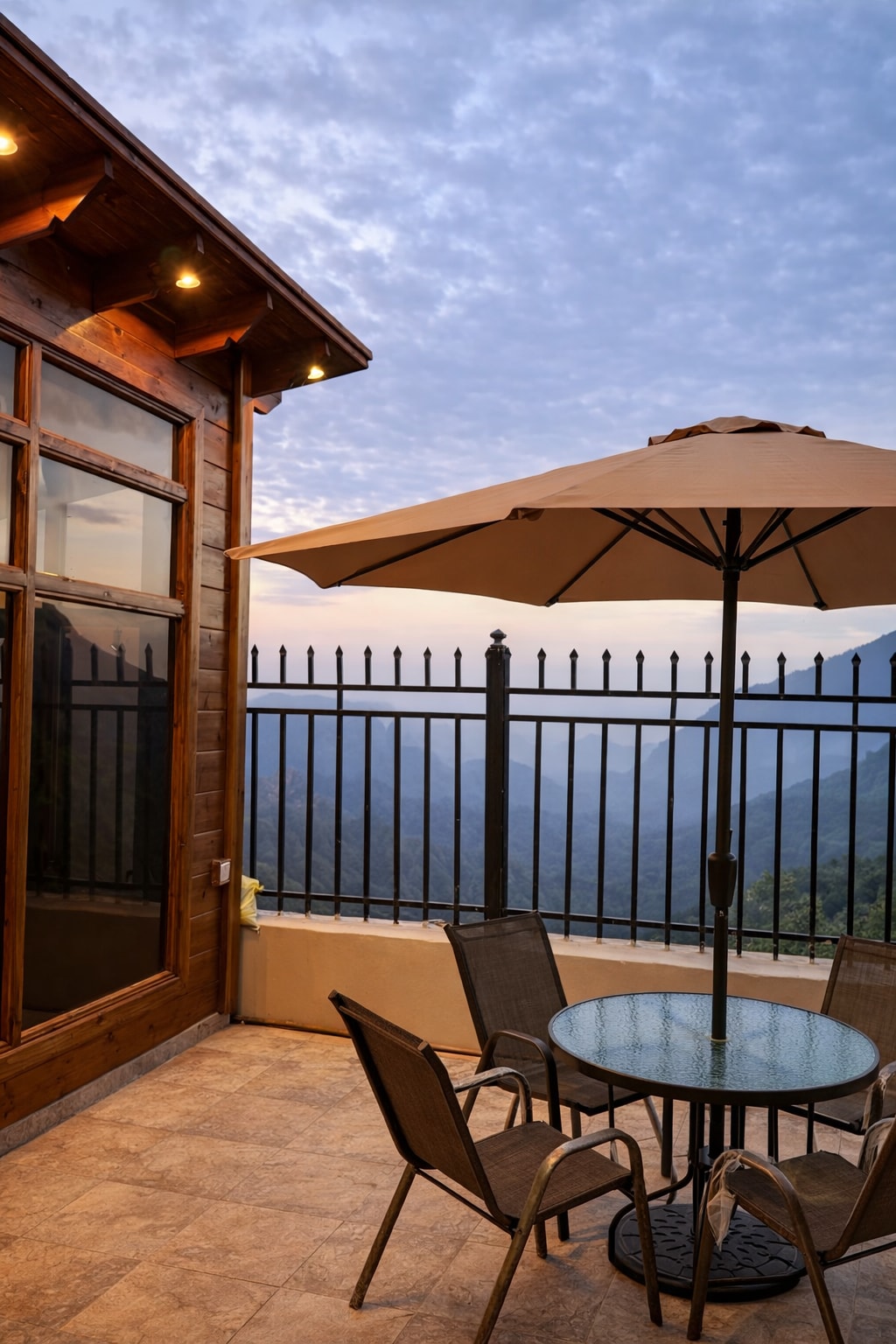 يتربع كوخ مطل الغيم الخشبي بهدوء على قمة أحد التلال المرتفعة، محاطًا بمناظر طبيعية خلابة ،بالبناء الخشبي ينسجم بشكل رائع مع المحيط الجبلي المكسو بالنباتات والأشجار. وكما ينفصل الكوخ عن العالم الخارجي، ينعزل الزائر أيضًا في جو من السكينة والهدوء والضباب الرقيق يلف المكان بغموض وسحر، مضفيًا جوًا من الخيال والرومانسية. وخارجًا، المناظر البنورامية مذهلة الوديان العميقة والجبال الشامخة تغمرها ضباب خفيف يضفي عليها طابعًا سحريًا. وقربه من شارع المنسك المليئ بالمطاعم والمحلات التجارية ويبعد ٧ دقائق