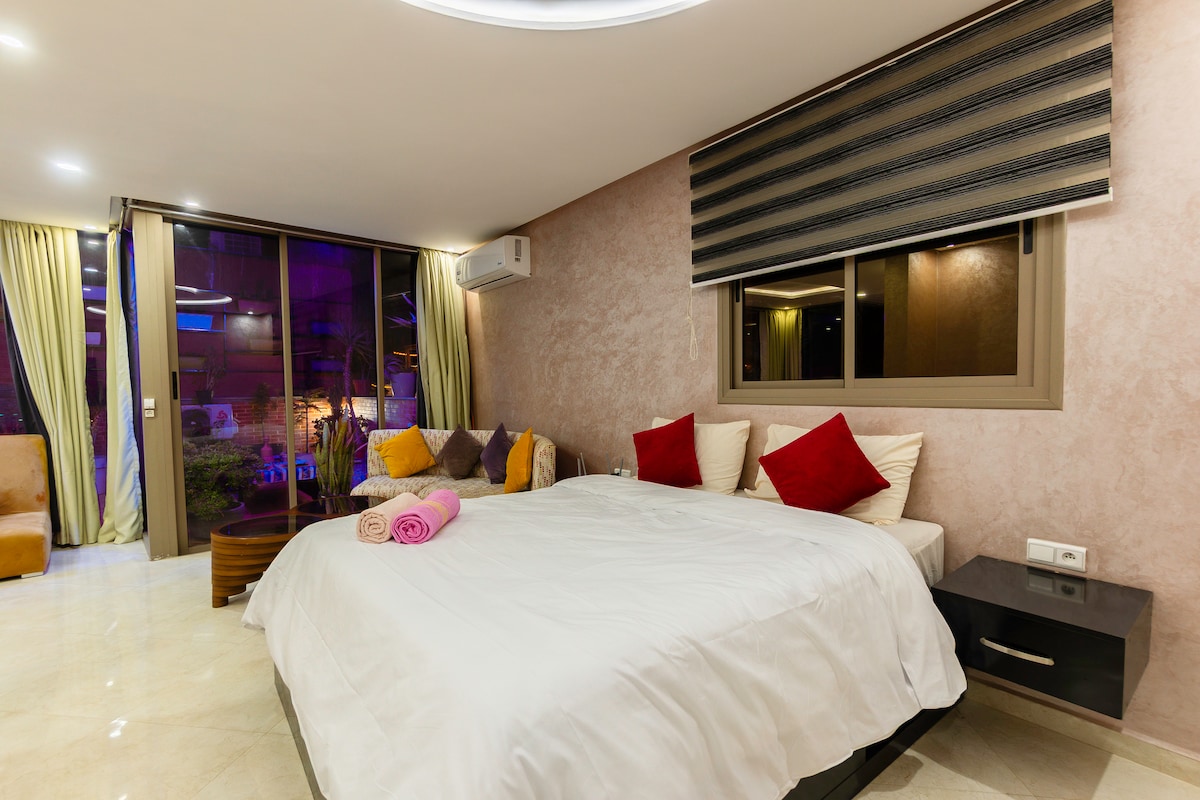 appartement de haut standing dans l endroit le plus prisé d Agadir vous trouverez à proximité ,cafés restaurants ,plage ,spa et hamam. lappartement est idéal pour 4 personnes mais peut accueillir jusqu a jusqu'à 6 personnes L appartement est équipé d une tv led curved,des chaînes satellites (tf1 M6 canal Beinsport ), wifi, 1 grande piscine dans la résidence ,parking gratuit,gardiens 24/24
