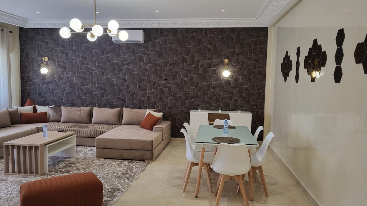 Apartmanunk Tanger központjában található. Közel minden létesítményhez. Az egész csoport könnyen hozzáférhet mindenhez. A lakásban egy nagy, 8 fős csoport vagy egy nagy, gyermekes család fér el. Ennek az egyedi szálláshelynek saját stílusa van. A lakás modern és nemrég felújított. Wi-Fi, központi légkondicionálás, mosógép, szárítógép, tévé, Nespresso kávéfőző.