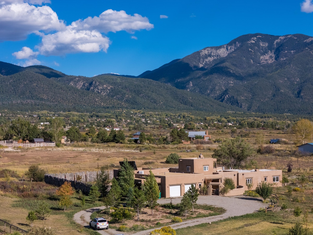Lenyűgöző kilátás. Passzív napenergia fedett üvegházakkal, 13,10' magas termikus ablakokkal. Ez a legmelegebb ház, ahol télen jártál, még a padlófűtés használata nélkül is. 4300 négyzetméter 6 hálószobával, 7 ággyal. 10-14 fő, nagy fürdőkádak és pezsgőfürdő, infraszauna, mosógép, minden konyhai kényelmi szolgáltatás, grillező, WIFI. Padlófűtés 15 perc síeléshez 15 perc Taoshoz. Utolsó ház a magánutamon, kilátással a Valdez-völgyre, végtelen túraútvonalakkal, sífutással vagy hegyi kerékpározással!