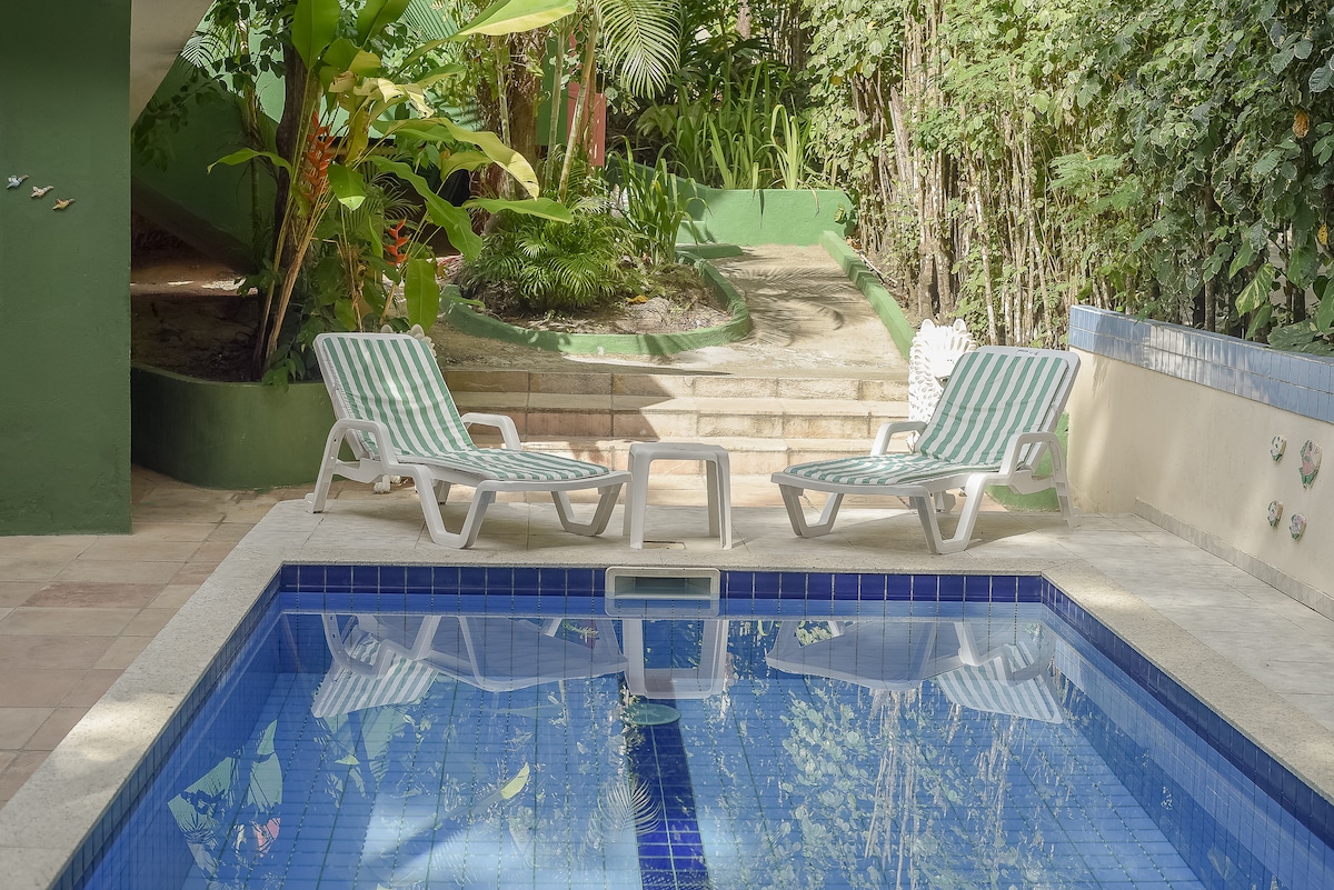 Hangulatos faház kevesebb mint 5 perc sétára Brazília legbájosabb utcájától, a Rua do Mucugê-től, a strandoktól és a kényelmi szolgáltatásoktól. Készen állunk arra, hogy egyedi vakációkat biztosítsunk neked, kihasználva a történelmi Arraial d 'Ajuda minden pillanatát. Teljes faház franciaággyal, légkondicionáló, saját fürdőszoba, erkély függőággyal és teljes konyha (hűtőszekrény, tűzhely és evőeszközök). Csendes környezet kényelemmel és minőséggel