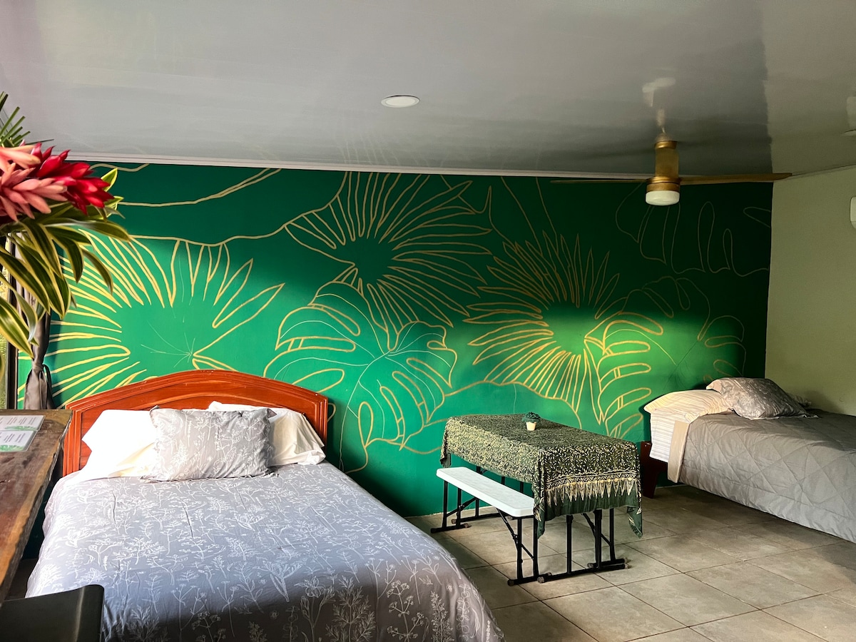 Private studio surrounded by nature, perfect for a peaceful and comfortable stay. Features an equipped kitchen, private bathroom, 2 beds (1 queen, 1 full) , A/C, and hot water. Wake up with your morning coffee and enjoy lush green views, with possible sightings of monkeys, toucans, and local wildlife. Located 5 min from the hospital, 15 min from Quepos downtown , and 20 min from beaches, waterfalls and national parks. Includes secure parking, easy access, and public transportation every 30 min