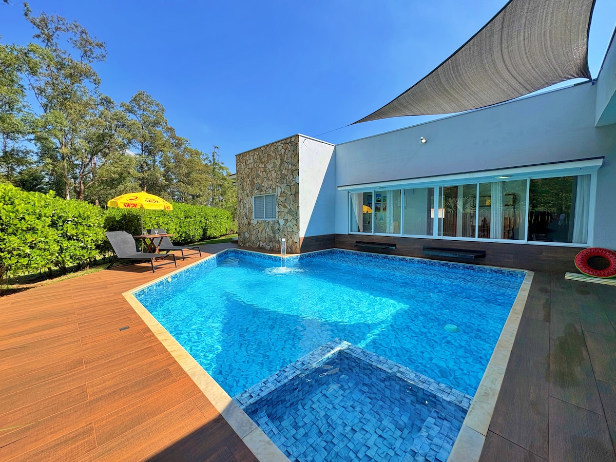 Casa de Campo – Conforto e Lazer em Meio à Natureza Desfrute de dias inesquecíveis nesta charmosa casa de campo em condomínio fechado, rodeada por muito verde e com acesso a 5 lagos para momentos de paz e conexão com a natureza. Acomodações • 4 dormitórios (sendo 3 suítes) • Suítes e sala principal com ar condicionado. Lazer e Relaxamento • Piscina aquecida (consultar taxas) • banheira • Mesa de ping pong e Futmesa • Quadriciclo disponível (consultar taxas) * Ofurô (consultar taxa)