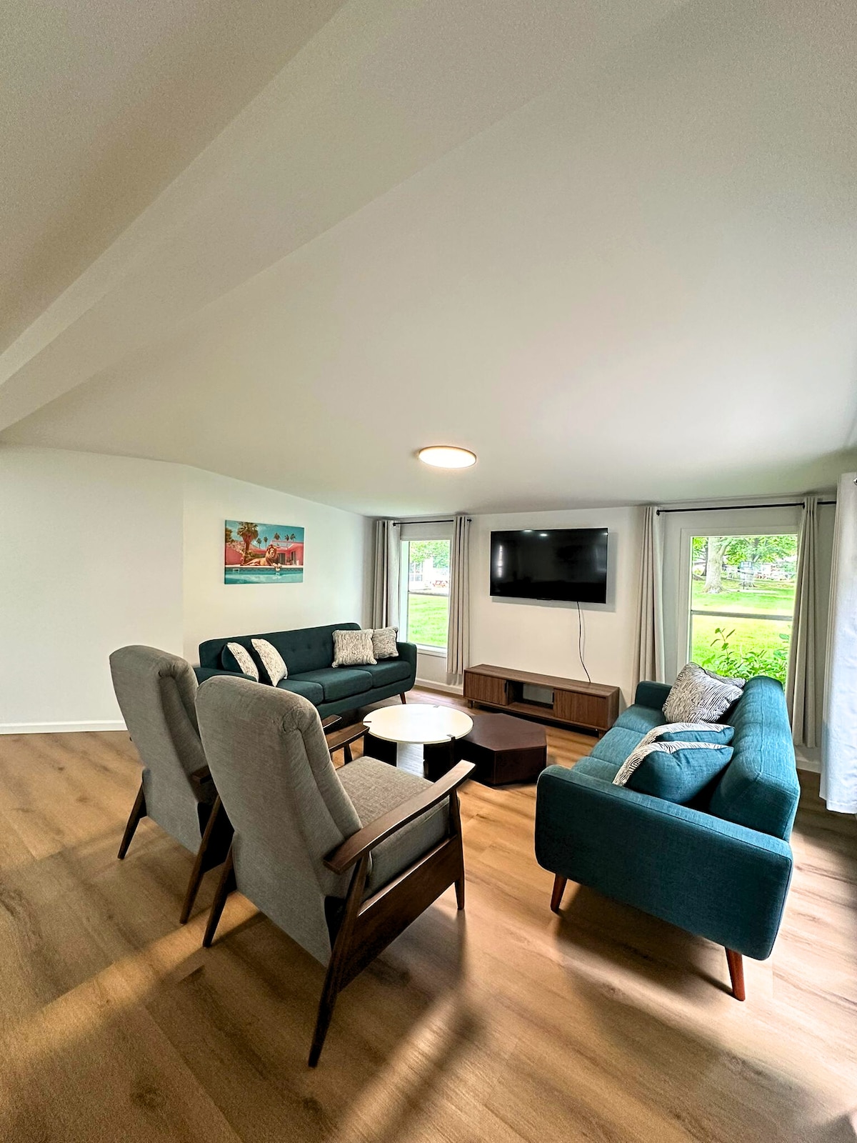 Haven in the Wood is a mid-century A-frame nestled in a lake community right across the street from a private all-sports lake. This recently renovated cabin features an open concept floor plan and boasts a modern-rustic aesthetic. The cabin resides in the heart of northern Michigan with proximity to many golf and ski resorts, nature and snowmobile trails, lakes and state parks. Listen to records, have a bonfire, relax in the hot tub, or take a walk along the beautiful Lake Louise!