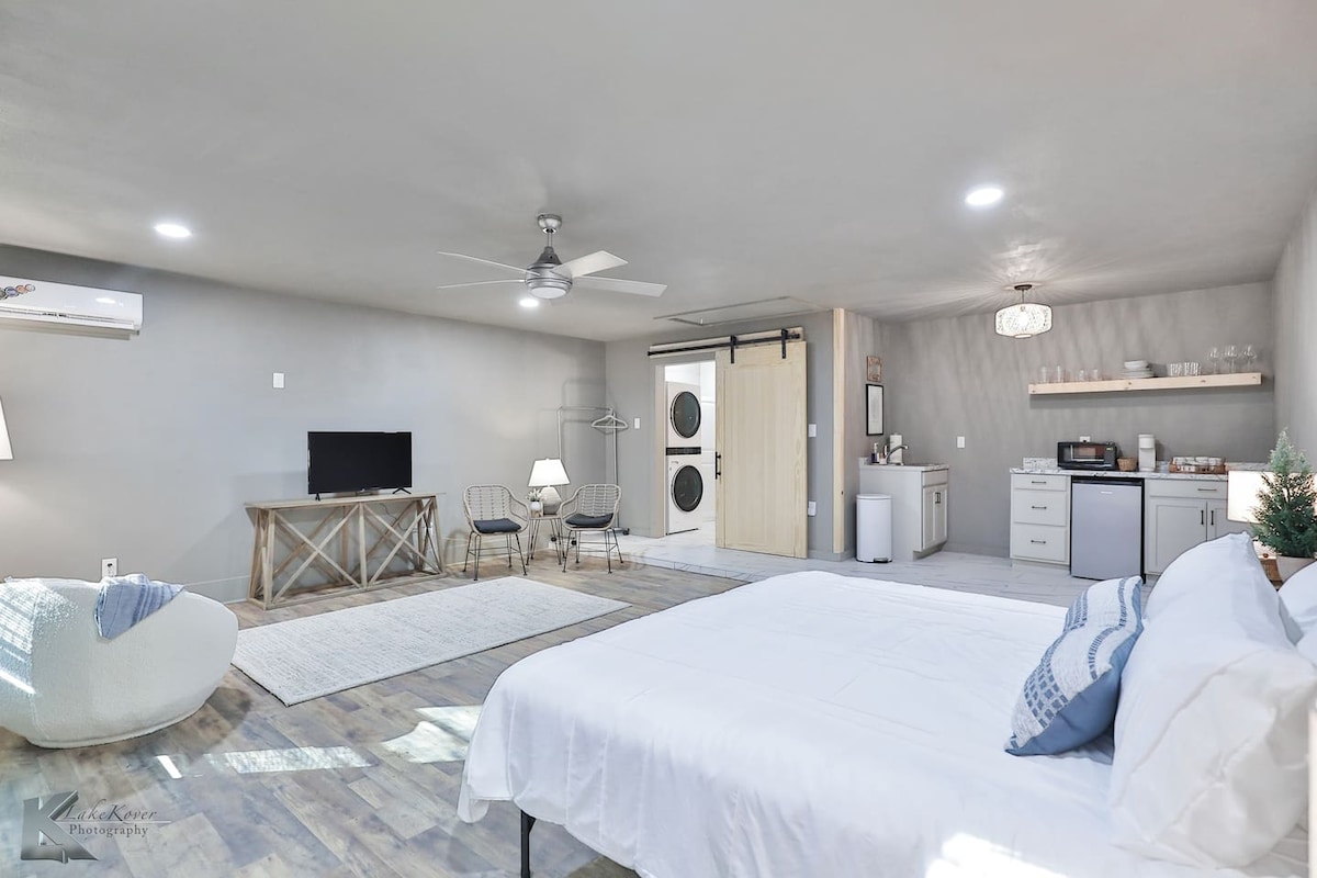 Központi elhelyezkedésű garázs stúdióapartman a belváros, a SoDA kerület és a McMurry Egyetem közelében. Kisállatbarát! Ez a stúdiószoba KING-SIZE Murphy ággyal és kényelmes matraccal rendelkezik. Van egy kis teakonyha mini hűtőszekrénnyel, mikrohullámú sütővel, kenyérpirítóval és kávéskannával. Az egységben TV és wifi is rendelkezésre áll. Ez a hely nagyszerű egyéni utazóknak vagy pároknak.