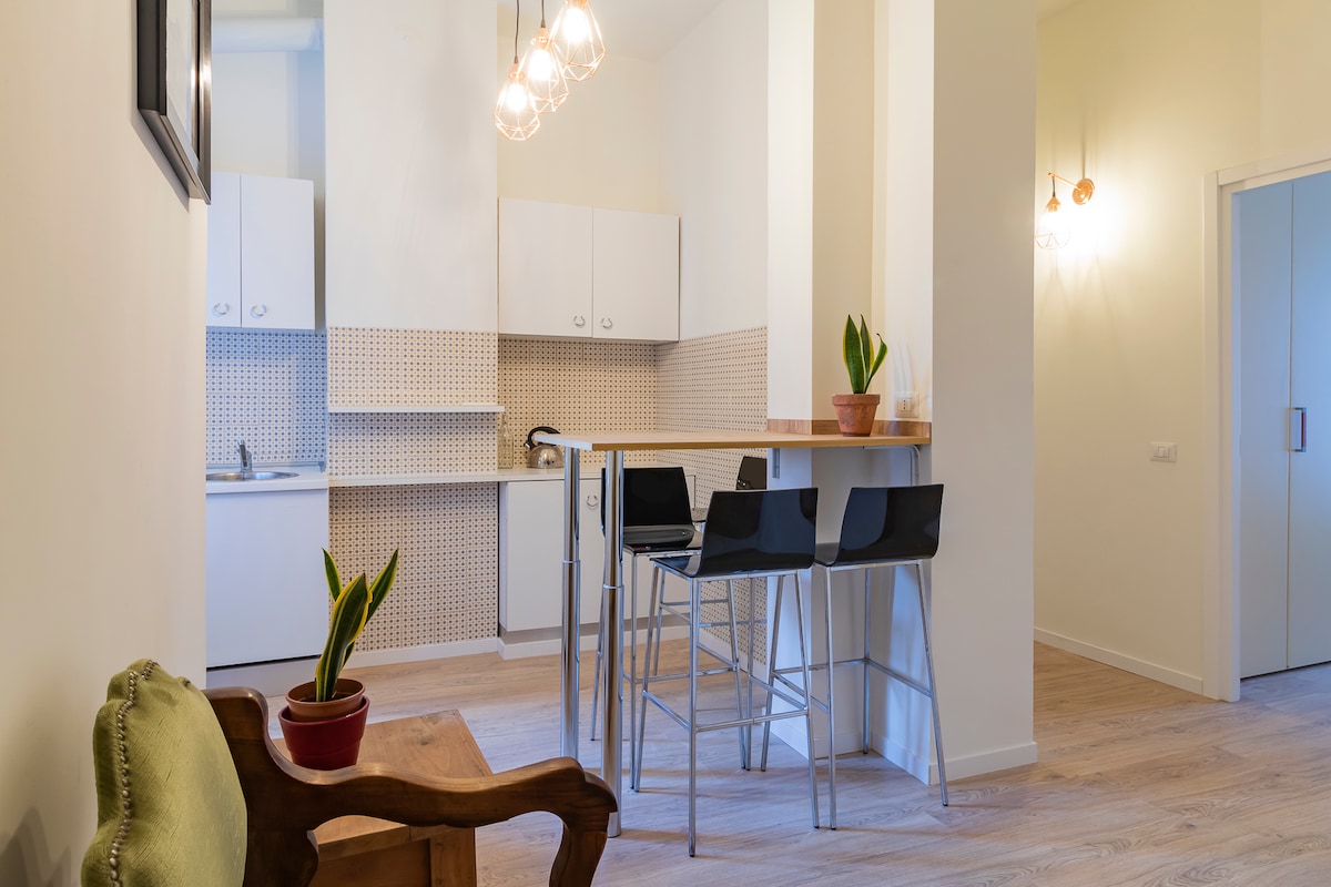 Penthouse, amelyet Milánóra néző zöldövezet vesz körül. Az apartman a nyolcadik és az utolsó emeleten található, és egy nyitott térből áll konyhával és kétszemélyes kanapéval (két felülettel a lehető legjobb pihenés érdekében), hálószoba franciaággyal és karosszékággyal, valamint fürdőszoba. A lakásból csodálatos panoráma nyílik a Duomo városrészre és a városközpontra, amelyet egy pohár borral értékelhetsz a sífutó ablakból.