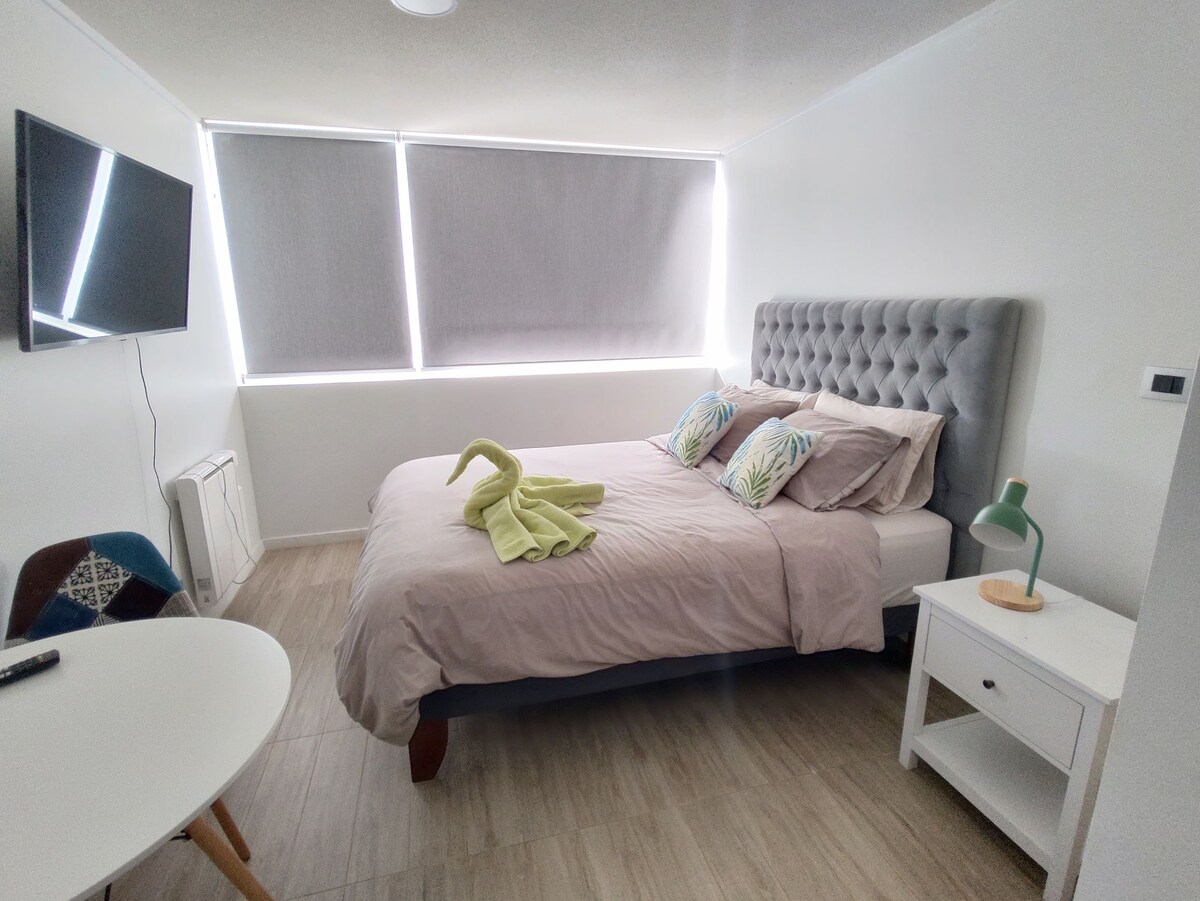 Céntrico departamento tipo estudio para 2 personas, está diseñado para brindar comodidad a quienes deseen explorar los encantos de Valdivia, el edificio esta cerca de los mejores bares y restaurantes de la ciudad donde puedes acudir caminando. CARACTERÍSTICAS: -Queda a minutos caminando del centro. -Baño equipados toallas para dos personas. -Cocina con elementos básicos para cocina exprés. -Locomoción a la puerta del edificio. -Wifi propio del depto. *No cuenta con estacionamiento propio.