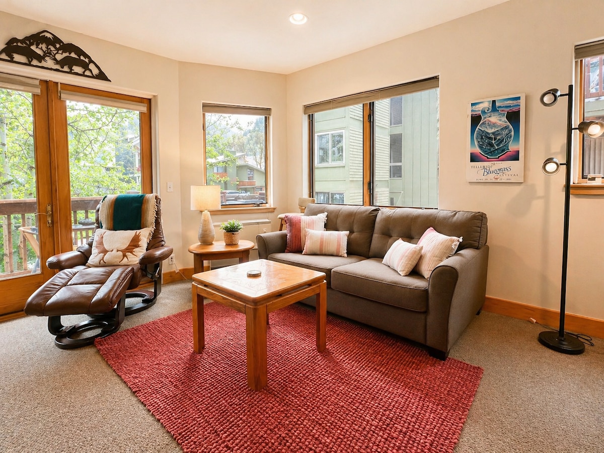 Well-maintained apartment located right in the heart of town, offering privacy and peace while keeping you close to all the action Telluride has to offer. Fully equipped with new kitchen appliances and all the comforts of home. Situated on a quiet street with sunset viewsoverlooking the high school ball field. Enjoy hot tub access from the deck, complete with complimentary robes. Free parking, washer/dryer combo, full amenities, and thoughtfully curated decor for a cozy, beautiful stay. #018108