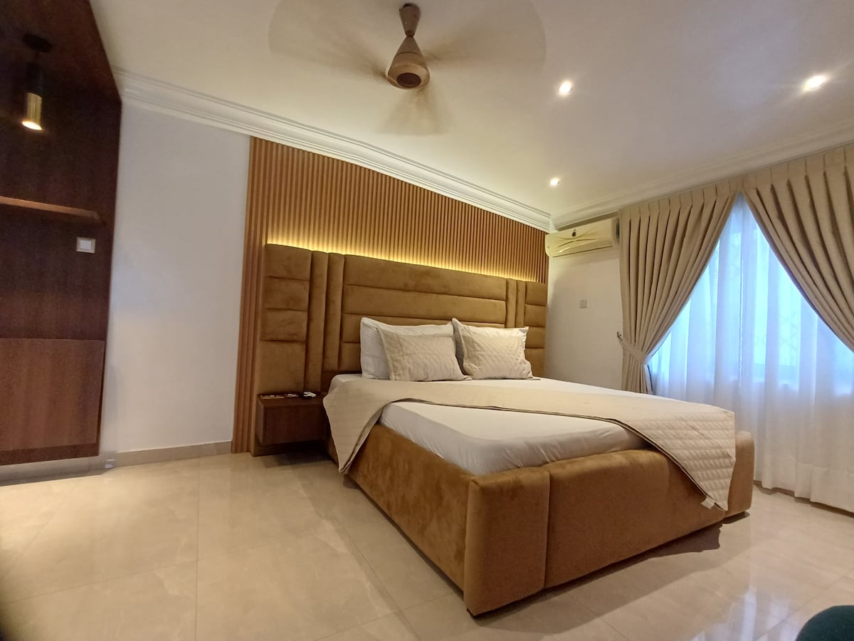 Relax in our stylist yet cozy flat with king size bed,WiFi, standby Generator, Ac, kitchen ,coffee machine, hair dryer, spacious living area, guess washroom, washing machine ) located 3 minutes walk away from Trasaco spring estate. Perfect for couples, solo guests and a family or 3