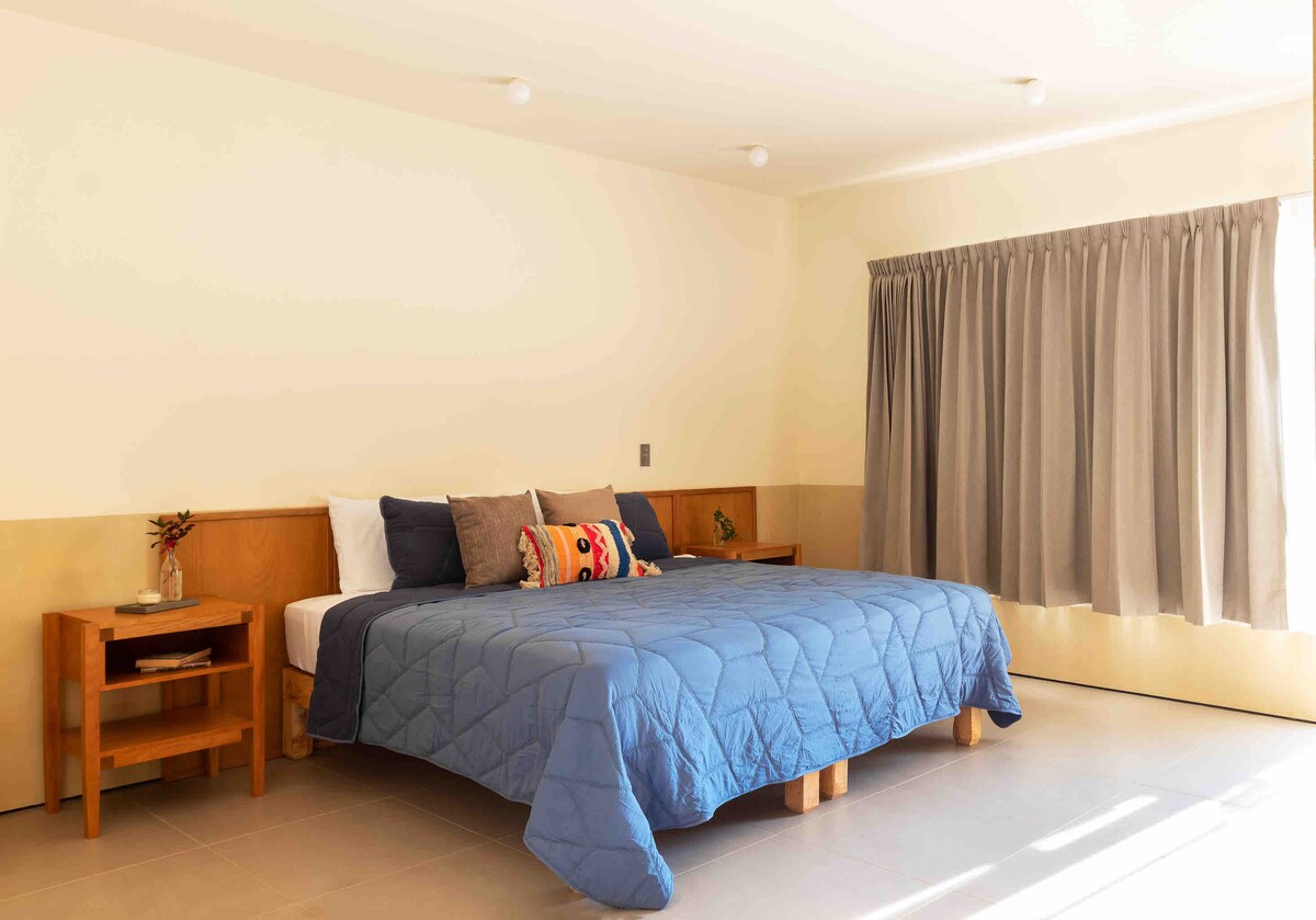 Élvezd ennek a csendes és központi szálláshelynek az egyszerűségét, amelynek többi része egy king méretű ágy és 4 közös franciaágy, egy nappali és légkondicionáló, egy fürdőszoba ,konyha,étkező 50 méterre Tepatitlan belvárosától, ahonnan nagyon kellemes kilátás nyílik az éttermi kerítésekre,a centenáriumi piacra és a sziget központjára