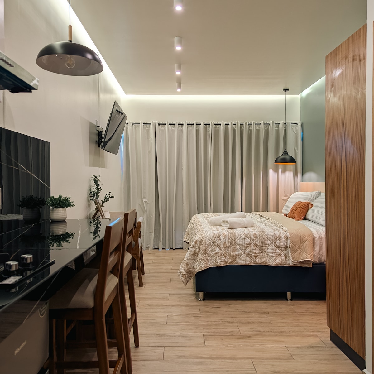 Élvezd a kényelmes és teljesen új helyet, amely ideális rövid vagy hosszú távú foglalásokhoz. Ez a hangulatos stúdió king méretű ággyal, tévével, teljes fürdőszobával és egy teljesen felszerelt konyhával rendelkezik, ahol elkészítheted a kedvenc ételeidet. Emellett pihenhetsz a kis privát teraszon is, amelyről kilátás nyílik a városra. Tökéletes utazóknak, pároknak vagy azoknak, akik kényelmet és közelséget keresnek Tepic főbb látnivalóihoz. Foglalj most, és élj át egy egyedi élményt!