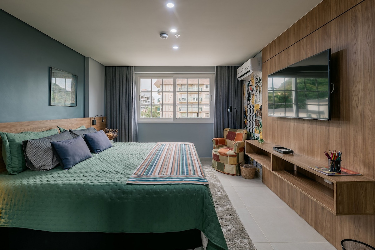 Csendes és szabad kilátással rendelkező lakásunk akár 4 fő elszállásolására is alkalmas. Ágynemű és fürdőszobai ágynemű az árban. Szívesen látjuk a gyerekeket! 24 órás recepció, biztonsági kamerák, garázs, úszómedence, szauna, játszószoba és edzőterem. Alto környékén találhatók a város fő látnivalói és gasztronómiája. Intermunicipal buszmegálló az ajtónál. Széles kereskedelem és szolgáltatások. 5 perc sétára a kézműves vásártól és a Vila St Gallen sörfőzdétől. Könnyen megközelíthető a Nemzeti Park és a Granja Comary.