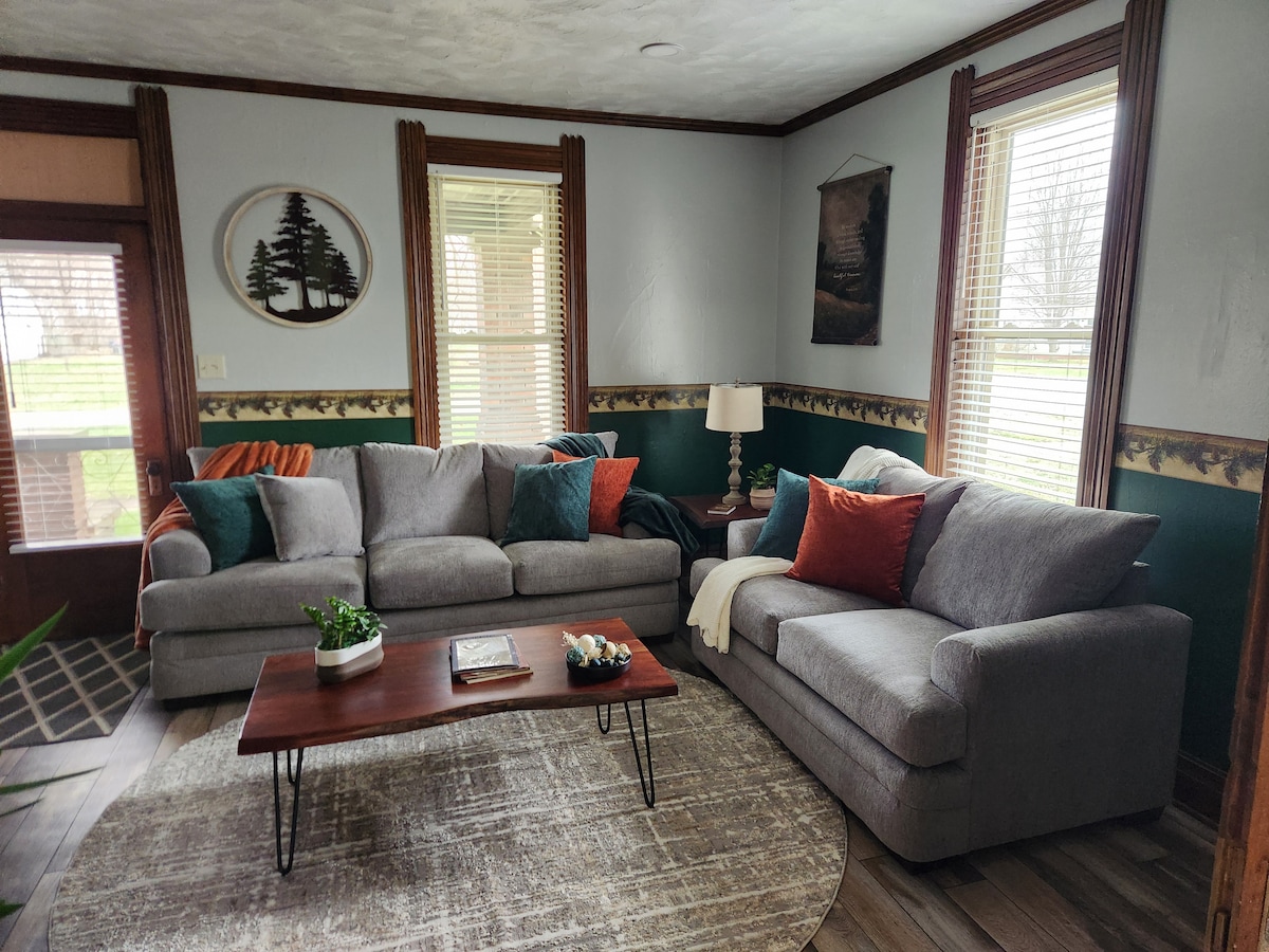 Békés vidéki otthon a 3 Fat Labs és a Depauw University közelében. Gyönyörű és csendes, 1 hektáros területen található, tűzrakóhellyel. Pihenj a hátsó teraszon, és élvezd a kilátást, látogass el az Oakalla fedett hídra, vagy túrázz a közeli Depauw természeti ösvényeken. Az otthonban saját lakosztály található king-size ággyal és nyitott alaprajzzal. Gyerekszoba emeletes ággyal, játékokkal és pakolással. Fürdőkád a második fürdőszobában. Élvezd a DVD-k és játékok széles választékát gyerekeknek és felnőtteknek. Műholdas TV és internet. Mosógép/szárítógép. Csak 3,5 mérföldre Depauw.