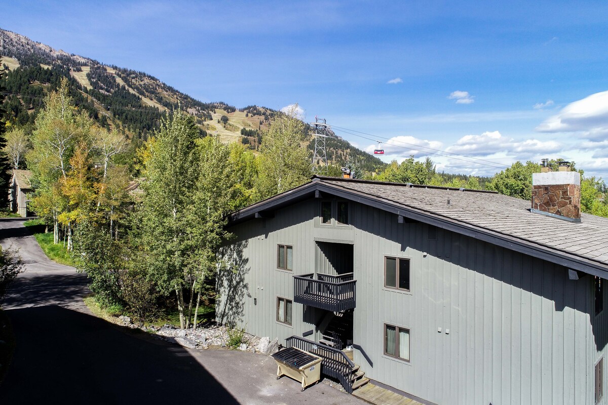 One of the best 1br flats in Teton Village. This top floor unit has no adjoining exterior walls, COMPLETELY PRIVATE. It has views of the ski area and the valley. The large living room has a new murphy queen bed to make room for up to 4 guests. It has great views and lots of natural light. Walk to 60 yards to moose creek lift or shuttle to tram. Enjoy the fireplace and deck, stocked kitchen. Enjoy exclusive access to the hot tub, pool, and tennis 80 yards away. New bbq and new couches.