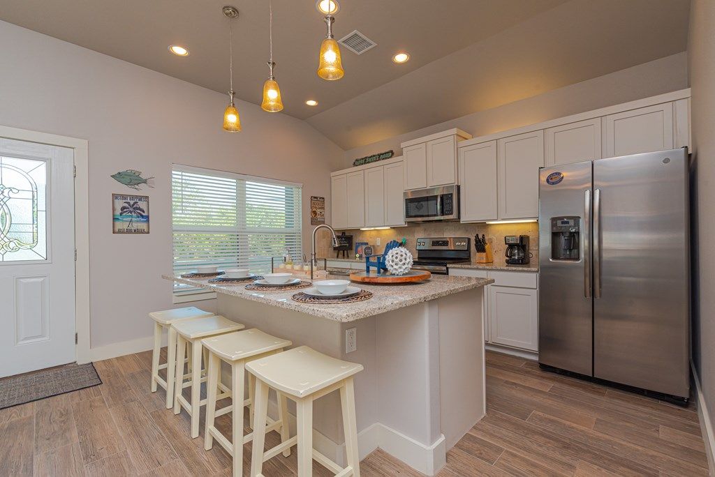 This charming Rockport home 2b/2b with pull out sofa in living room, is located in the heart of Rockport, just 1 mile from the beach park and 4 miles from Cove Harbor! Perfect for a weekend get-a-way with a large covered parking ready for your boat. Outdoor furnishings, BBQ pit, horseshoe pit and cable and wifi included. An open floorplan features high ceilings, huge granite kitchen island for guests. Big pantry & laundry room for storage and a HUGE walk in shower.