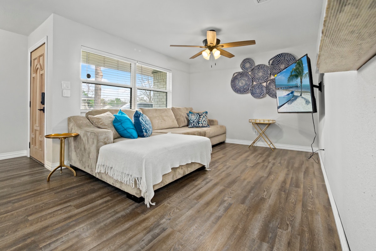 Elbűvölő és modern Airbnb teljesen felszerelt konyhával, hangulatos nappalival és stílusos étkezővel. Élvezd a nyugodt légkört, a természetes fényt és az átgondolt részleteket. A tágas hálószoba üvegajtós hozzáféréssel rendelkezik a nagy teraszhoz a csendes reggeli kávédhoz. Tökéletes egy kényelmes és pihentető tartózkodáshoz!Az elhelyezkedés könnyű hozzáférést biztosít 10 perces autóútra az AT&T stadiontól, hat zászló, 10 perces autóútra Dallas Downtown CottonBall városától, amely Grand Prairie belvárosának központjában található.