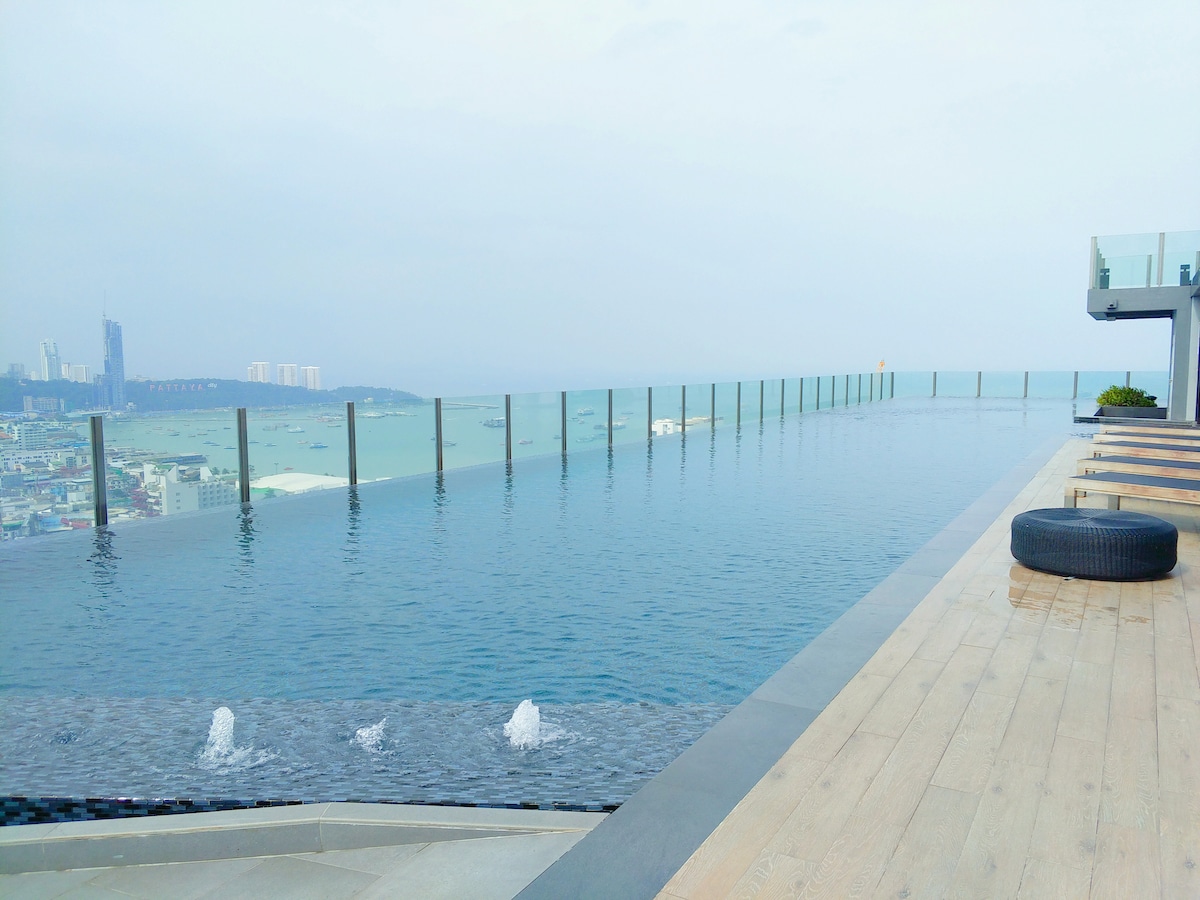 2022 NEWEST! MY HIGHEST FLOOR CONDO IN PATTAYA! SPECTACULAR! ONE OF A KIND OVER-HANGED ROOF TOP SWIMMING POOL SEA VIEWS STUDIO ROOM IN-ROOM WIFI ROUTER. NO SHARING WITH OTHER APARTMENTS -TO SLEEP 3 PERSONS, PLEASE READ "THE SPACE" -2 swimming pools, best condo gym in Pattaya -300m walks to Pattaya beach -3 mins walk to famous shopping centers, Central Festival, The Avenue - 5 mins walk to Soi Bua Khao -10 mins walkto Walking Street