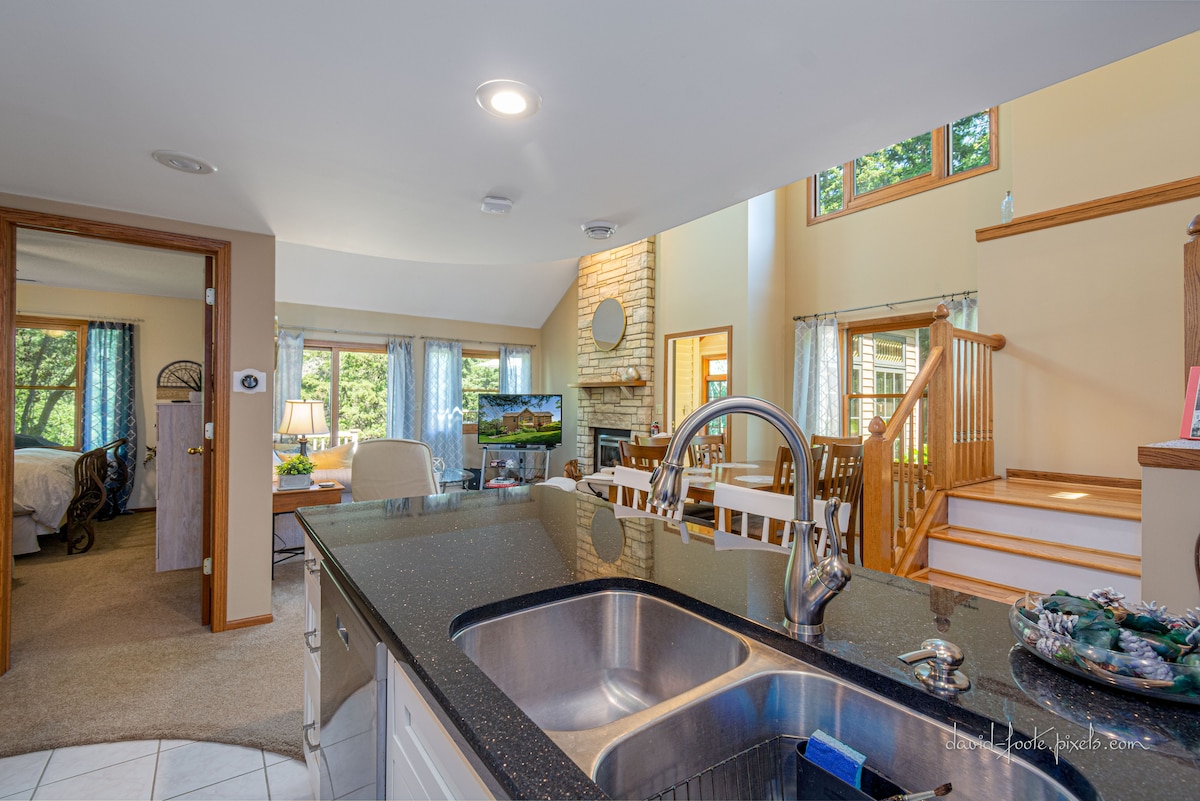 Unique "tree house" - an octagon tiny house, surrounded by the woods! 2 bedroom, 2 bathroom home you can enjoy the views of nature all around, with floor to ceiling windows. One king bed, one queen bed. Modern comforts with fun flash blacks. Private hot tub and firepit look into serene woods! Sit by the indoor gas fireplace and enjoy our record collection. Soak in a Japanese soaking tub. Enjoy fall colors or watch snow fall! Community indoor poor, seasonal outdoor pool, gym access