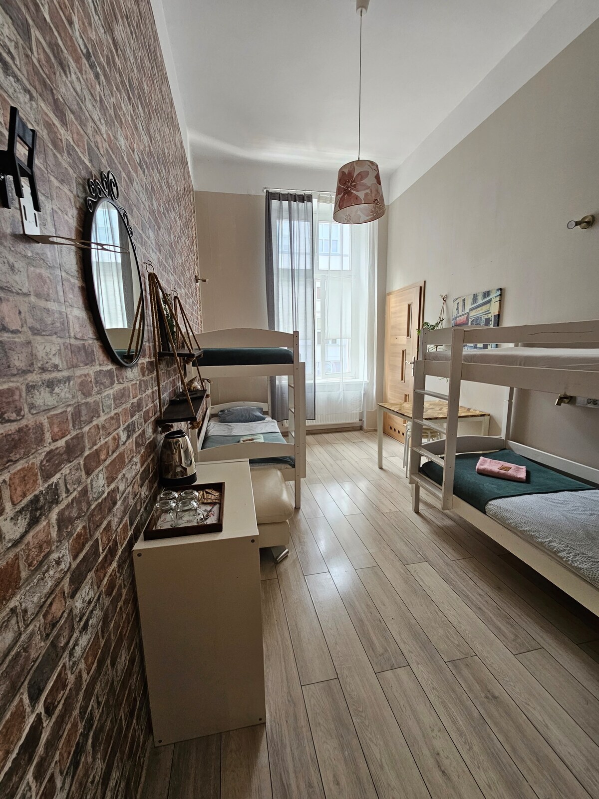 EDITH PIAF kollégiumi szoba 1-6 fő számára (22m2) 2. emelet. Két ágy, 90 cm-es egyszemélyes ágy és két emeletes ágy. A tér egyedileg van elrendezve. Lakásfelszerelés: 55 hüvelykes SMART TV, szekrény, kisasztal, ventilátor, asztal és székek. A szobában teljesen felszerelt konyha, vécé és zuhanyzó található, amelyen a hostel többi vendége is osztozik.