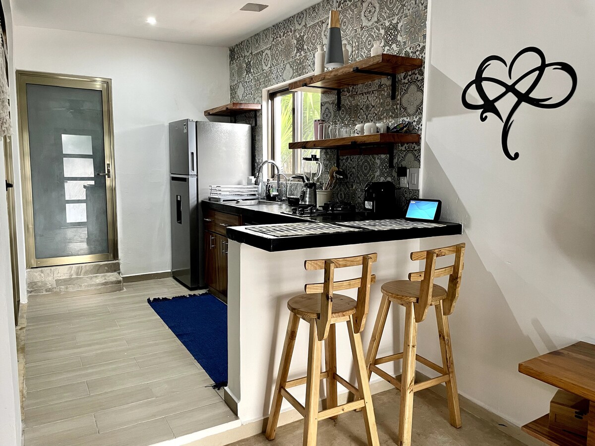 Gyönyörű luxus ház maja és keményfa stílusban. Egy autentikus prehispán élmény. A lakosztályban felszerelt konyha , fürdőszoba, hálószoba intelligens TV-vel , és szekrény, saját terasz és kert és egy nagy közös medence klórmentes. Gyönyörű luxus lakosztály gyönyörű fa felületekkel és maja stílusban. Egy autentikus prespanyol mexikói élmény. Felszerelt konyha, teljes fürdőszoba,hálószoba Smart TV-vel és szekrény, saját terasz és kert és nagy klórmentes medence, közös
