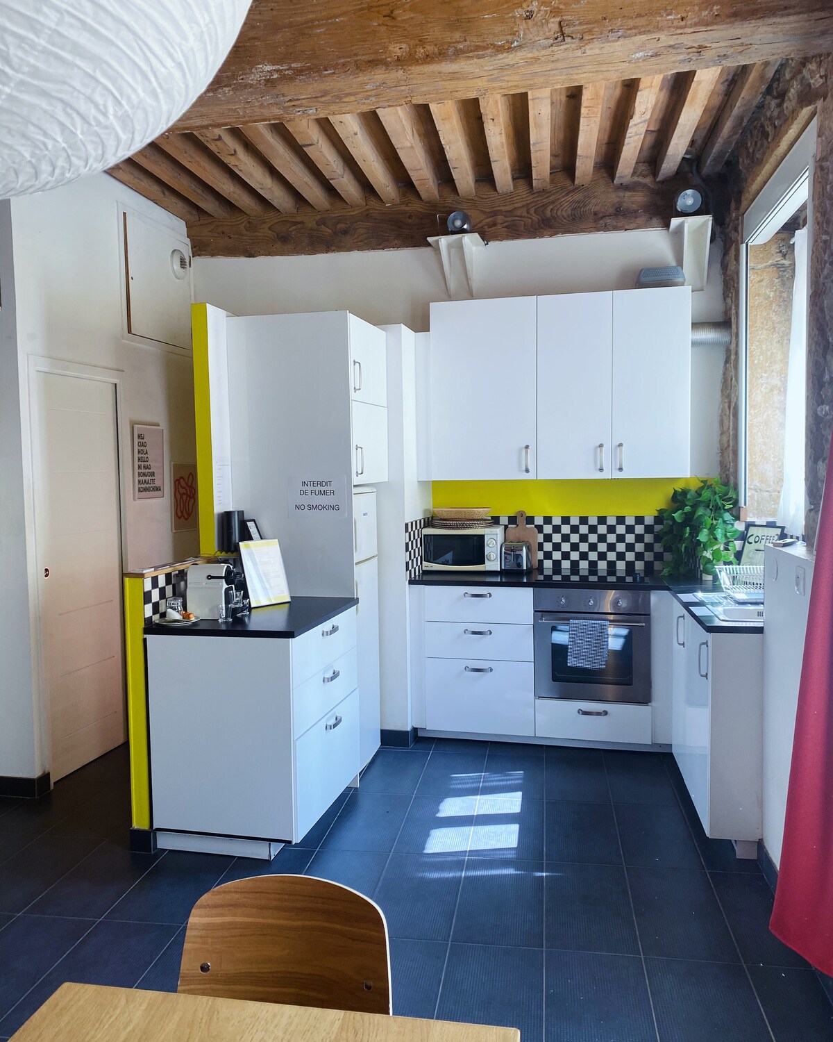 The apartment (45m²+ private patio) is located on the banks of the Saône, a 5-minute walk from the historic old Lyon district. Located on the 1st floor (no elevator), hillside of an old building on the bank of the Saône river, the building corridor is a little rustic (17th century). The apartment has been fully redesigned, keeping its authenticity. I made it my refuge, away from the hustle and bustle of Lyon. However, this place is not to everyone’s taste 😊. I describe later the pros & cons.